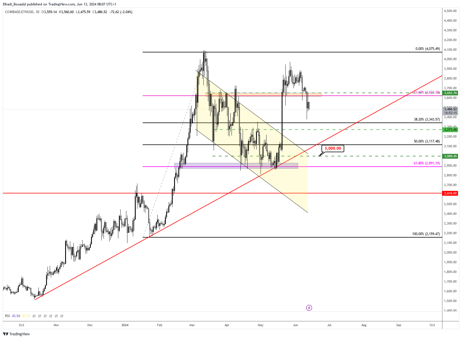 مستوى الدعم التالي يوجد عند سعر 3275 دولار، بالقرب من خط الاتجاه الصاعد الذي يشكّل سد قوي أمام أي هبوط قوي في السعر. و كسره سوف يعني عودة  سعر إيثيريوم ETH إلى تحت مستويات 3000 دولار.