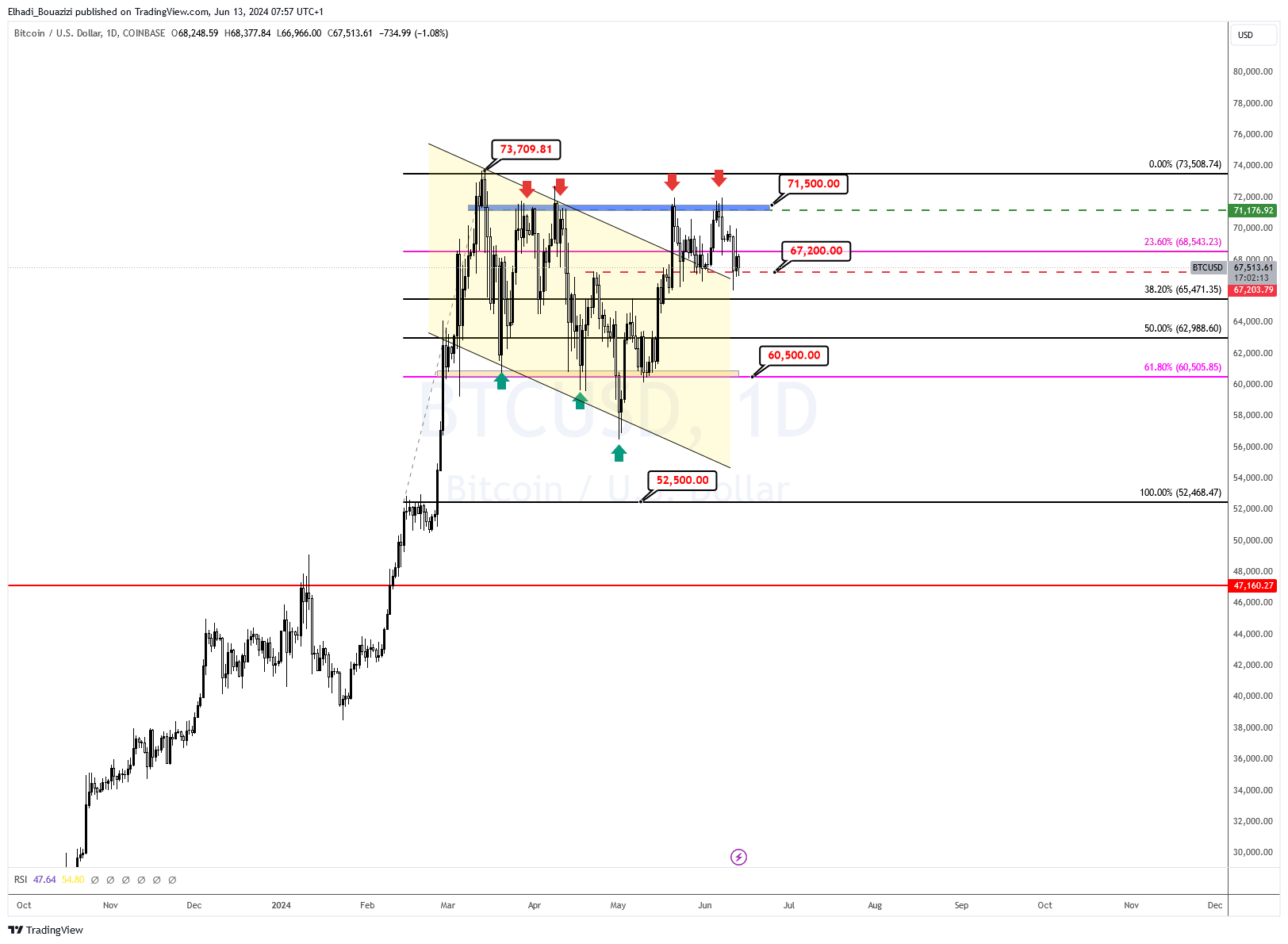 على الرسم البياني شكّل سعر BTC النموذج الفني الانعكاسي القمة الثنائية، مع خط العنق عند مستوى الدعم المحوري 67,200 دولار. و القمة عند مستوى المقاومة 71,500 دولار، و هي المنطقة التي كان يتحرك فيها منذ النصف الثاني من شهر مايو الماضي.