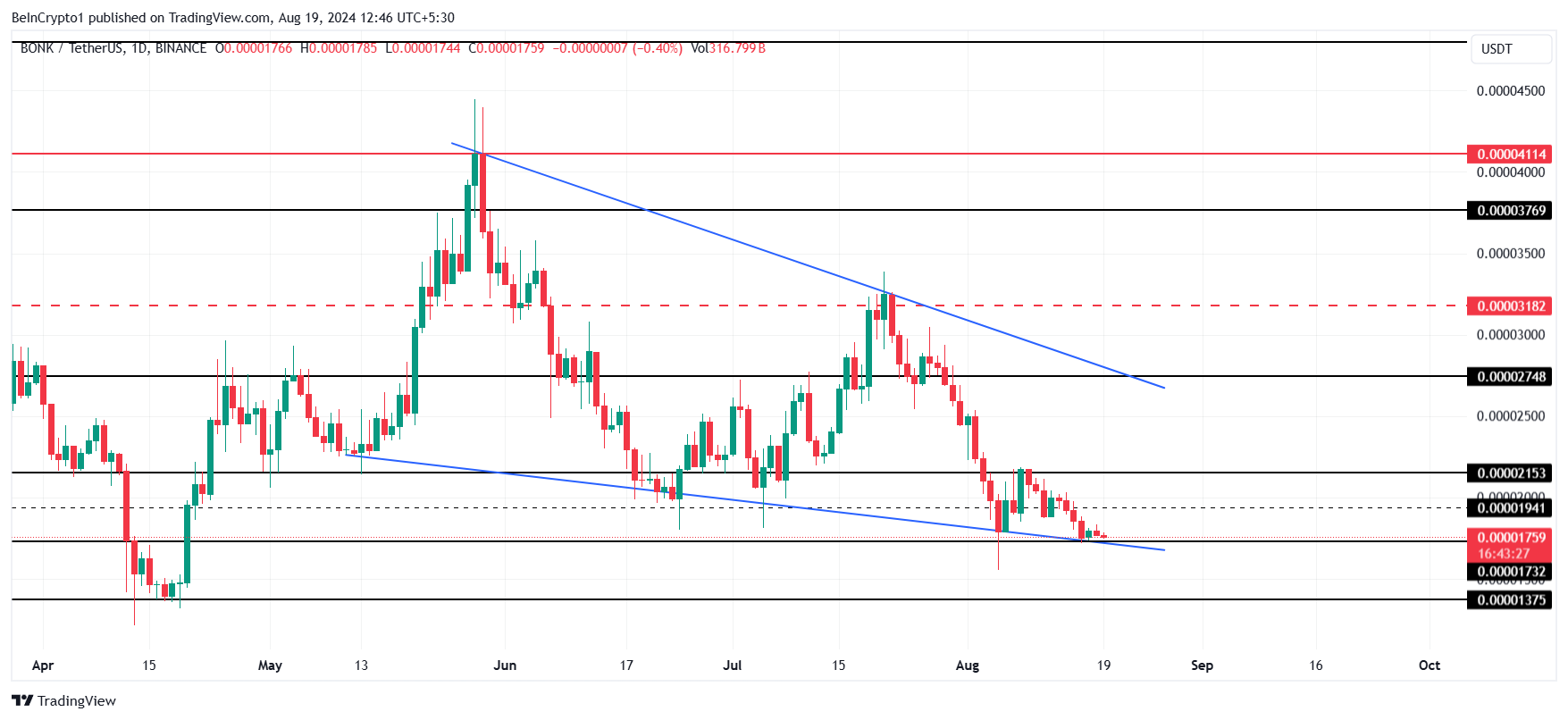 لكن إذا تم الحفاظ على دعم 0,00001732 دولار، قد يرتد بونك. هذا من شأنه أن يعطي العملة الميمية فرصة لتأكيد النمط الصعودي للوتد الهابط ولكن سيتطلب اختراق المقاومة عند 0,00002748 دولار.