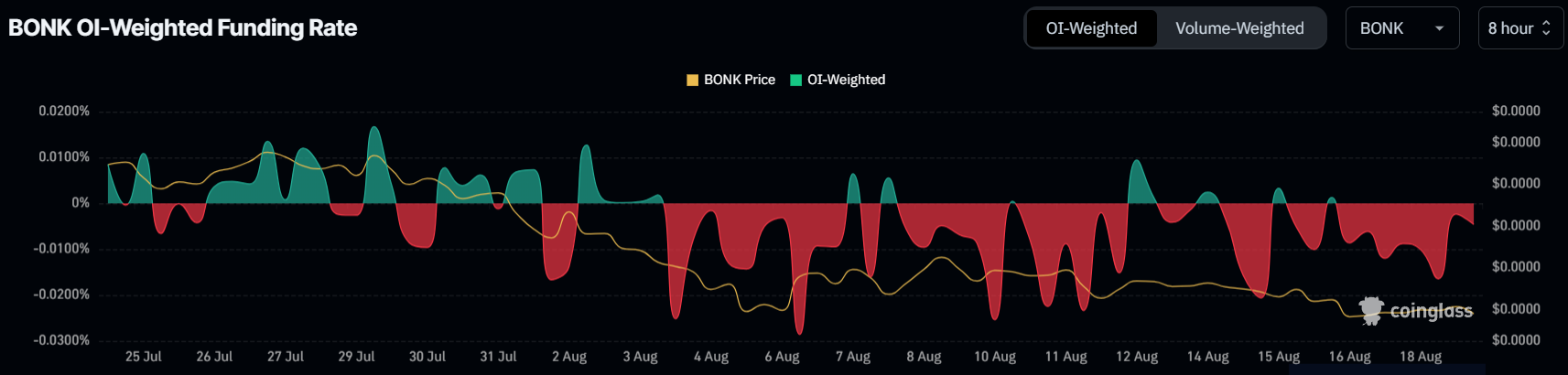 إضافة إلى المخاوف هو معدل التمويل السلبي بشكل كبير. هذا يشير إلى أن المستثمرين يراهنون بشكل متزايد على انخفاض سعر بونك. ينعكس هذا الشعور السلبي في التموضع العام للسوق، حيث تصبح المراكز القصيرة أكثر هيمنة.
