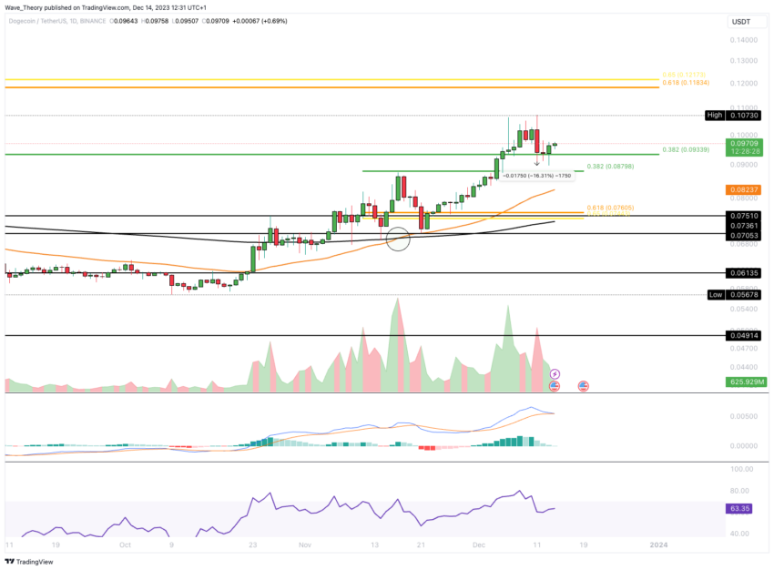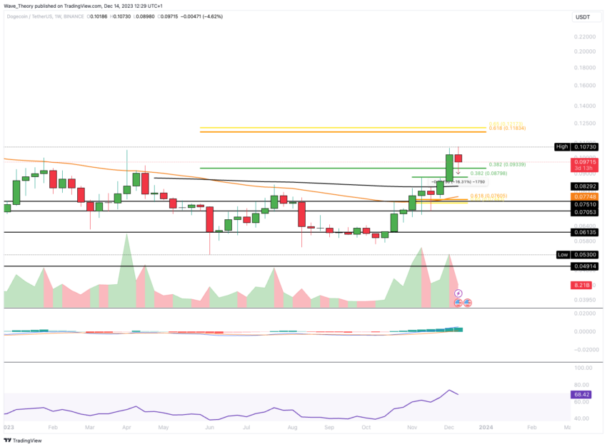 إذا نجحت DOGE في اختراق مستوى مقاومة النسبة الذهبية عند 0.1 دولار تقريبًا، فقد يشير ذلك إلى نهاية المرحلة التصحيحية الحالية ويحدد هدفًا جديدًا عند مستوى النسبة الذهبية عند حوالي 0.12 دولار.