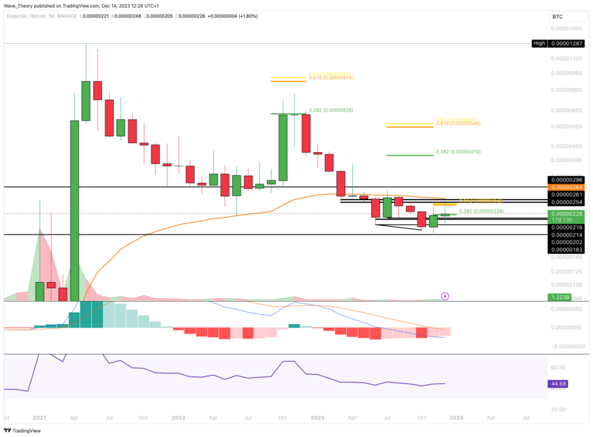 وفي تداولها مقابل بيتكوين (BTC)، واجهت DOGE رفضًا هبوطيًا هذا الأسبوع عند مستوى مقاومة النسبة الذهبية، حوالي 0.0000025 BTC. بعد هذا الرفض، تم وضع مستويات دعم فيبوناتشي (Fib) المهمة التالية لـ Dogecoin الآن عند حوالي 0.00000224 BTC و0.0000021 BTC.