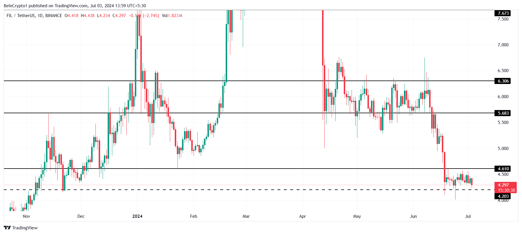 يتداول سعر فايلكوين FIL عند 4.29 دولار، وهو مقيد حاليًا ضمن حدود 4.61 دولار و4.20 دولار. كانت العملة البديلة في هذا النطاق لمدة أسبوعين حتى الآن، وسيتطلب الخروج منه ارتفاعًا بنسبة 7٪.