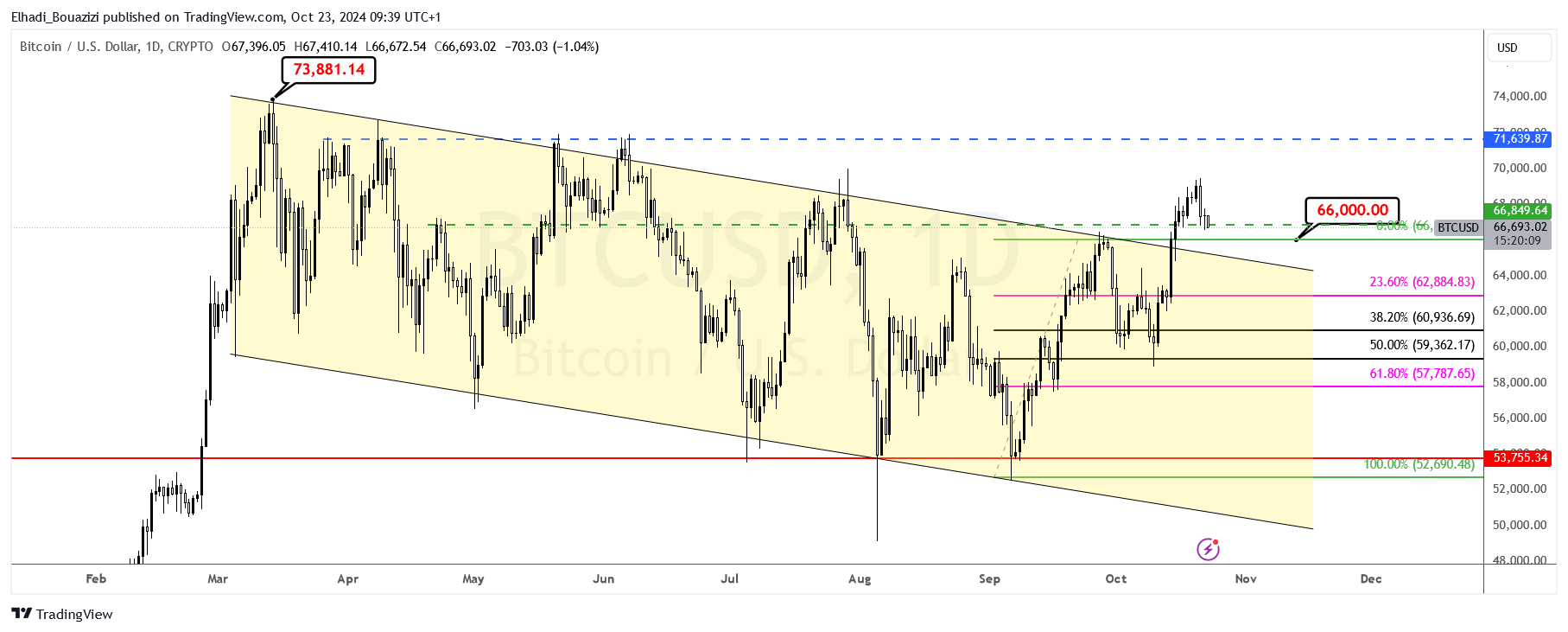 سعر BTC هبط في اليومين في حركة تصحيح هابطة و يتجه لإعادة اختبار القناة المكسورة في حدود منطقة الدعم فوق 66,000 دولار.