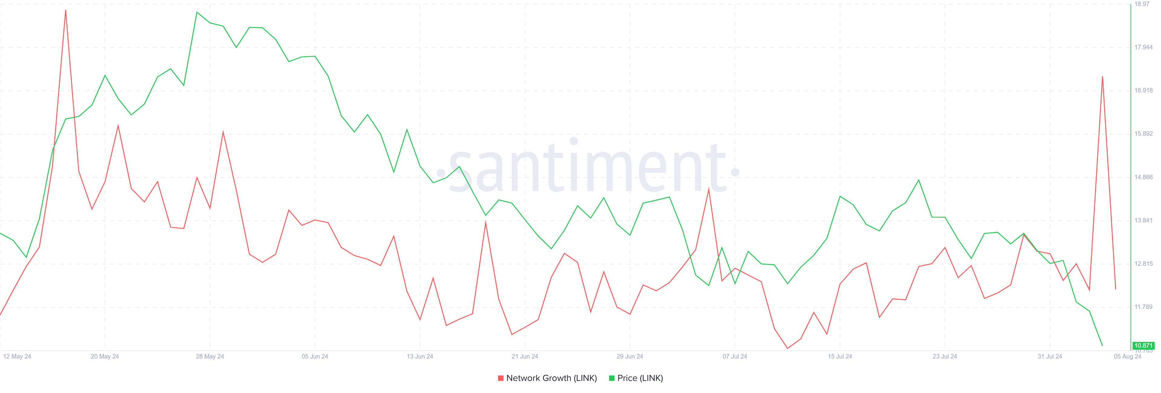 سعر تشينلينك حاليًا في أدنى مستوياته لعدة أشهر ومهيأ للتعافي المحتمل إذا تصرف المستثمرون عكس إشارات السوق الأوسع. وفقًا لمؤشر نمو الشبكة، كان هناك ارتفاع حاد في آخر 24 ساعة.