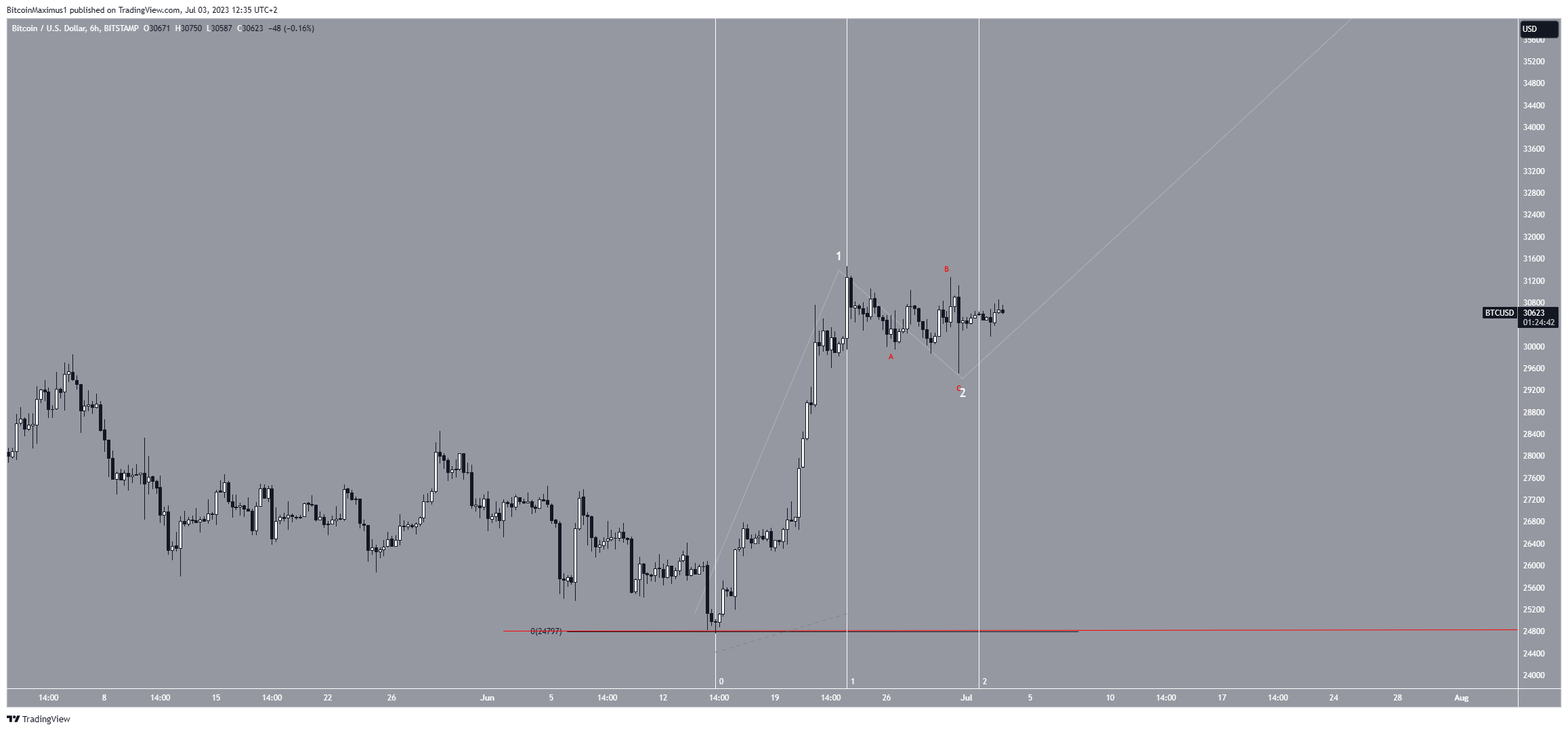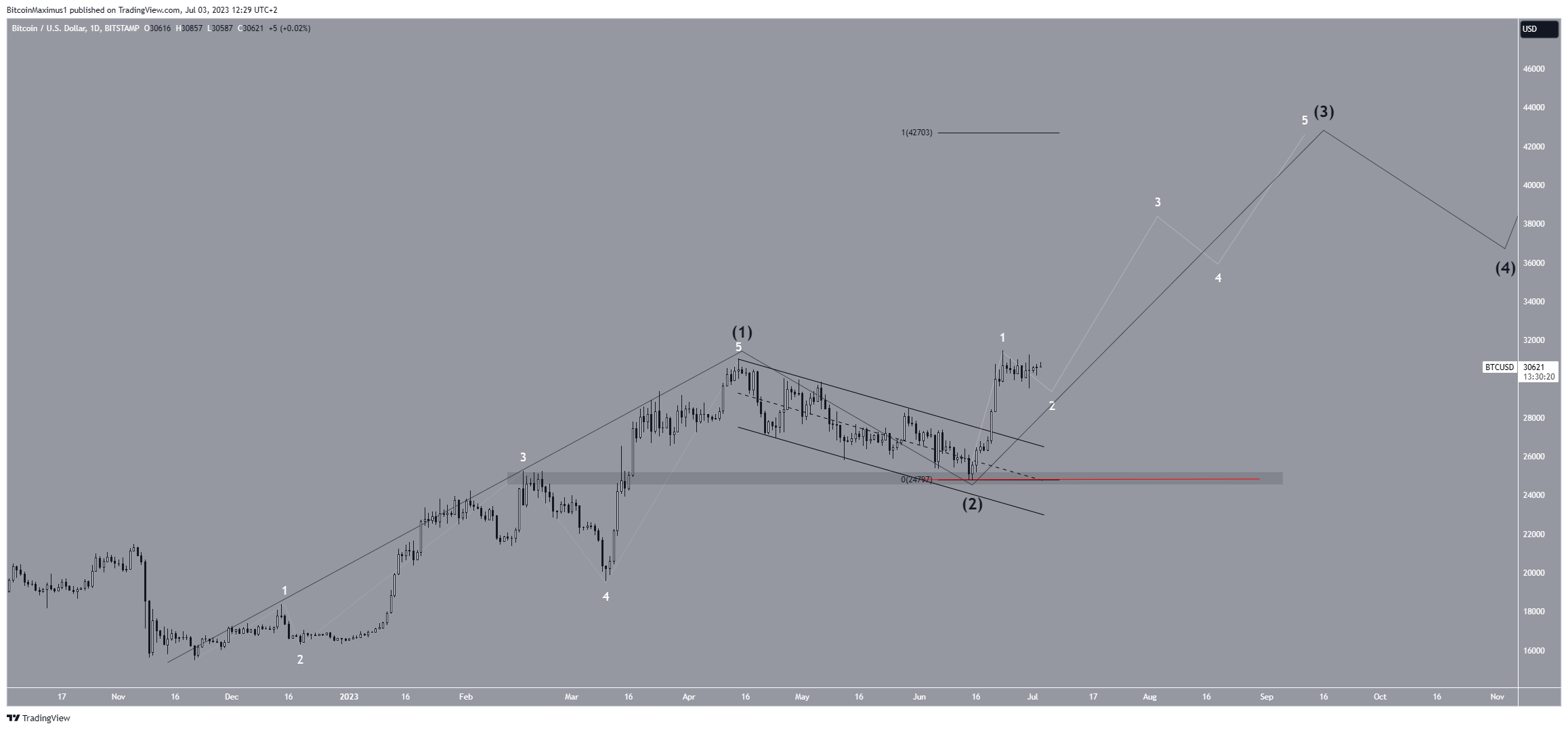 وعلى الرغم من هذا التنبؤ التصاعدي لسعر البتكوين على المدى الطويل، فإن التحرك تحت قاع الموجة الفرعية الأولى البالغ 24800 دولار (الخط الأحمر) سيعني أن الاتجاه لا يزال هبوطيًا. وفي هذه الحالة، من المحتمل حدوث انخفاض إلى 20000 دولار.