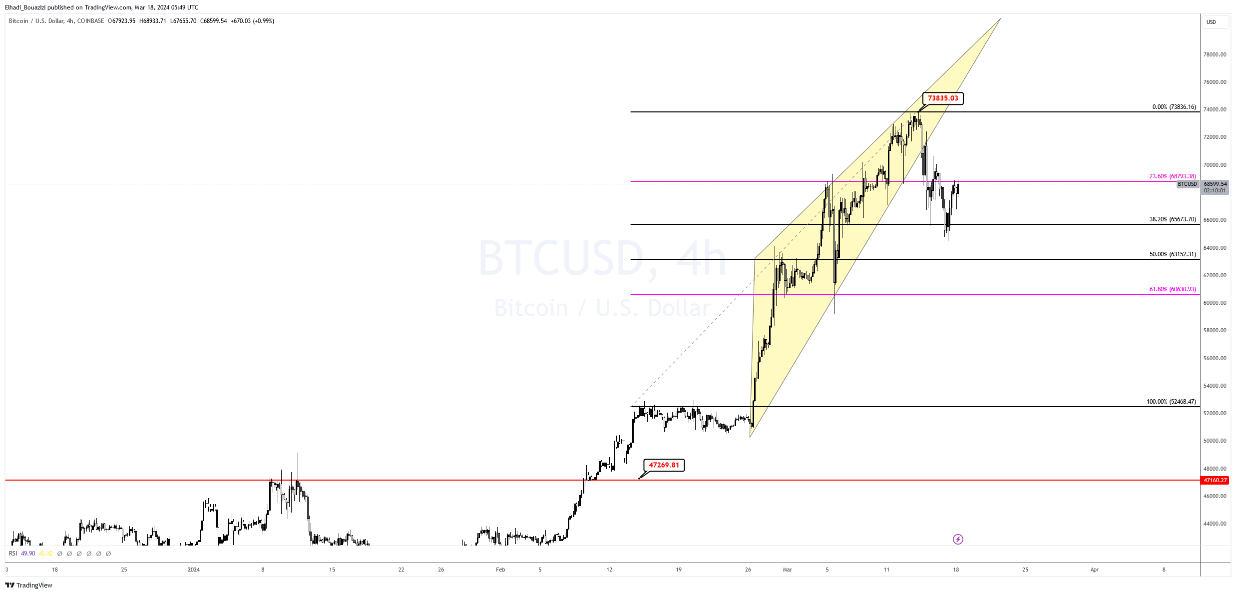 أغلب شموع الموجة الهابطة أغلقت في حدود مستوى 38,2% عند 65,500 دولار. وحاليا سعر BTC يتراوح تحت مستوى 23.6% عند 68,500 دولار.
