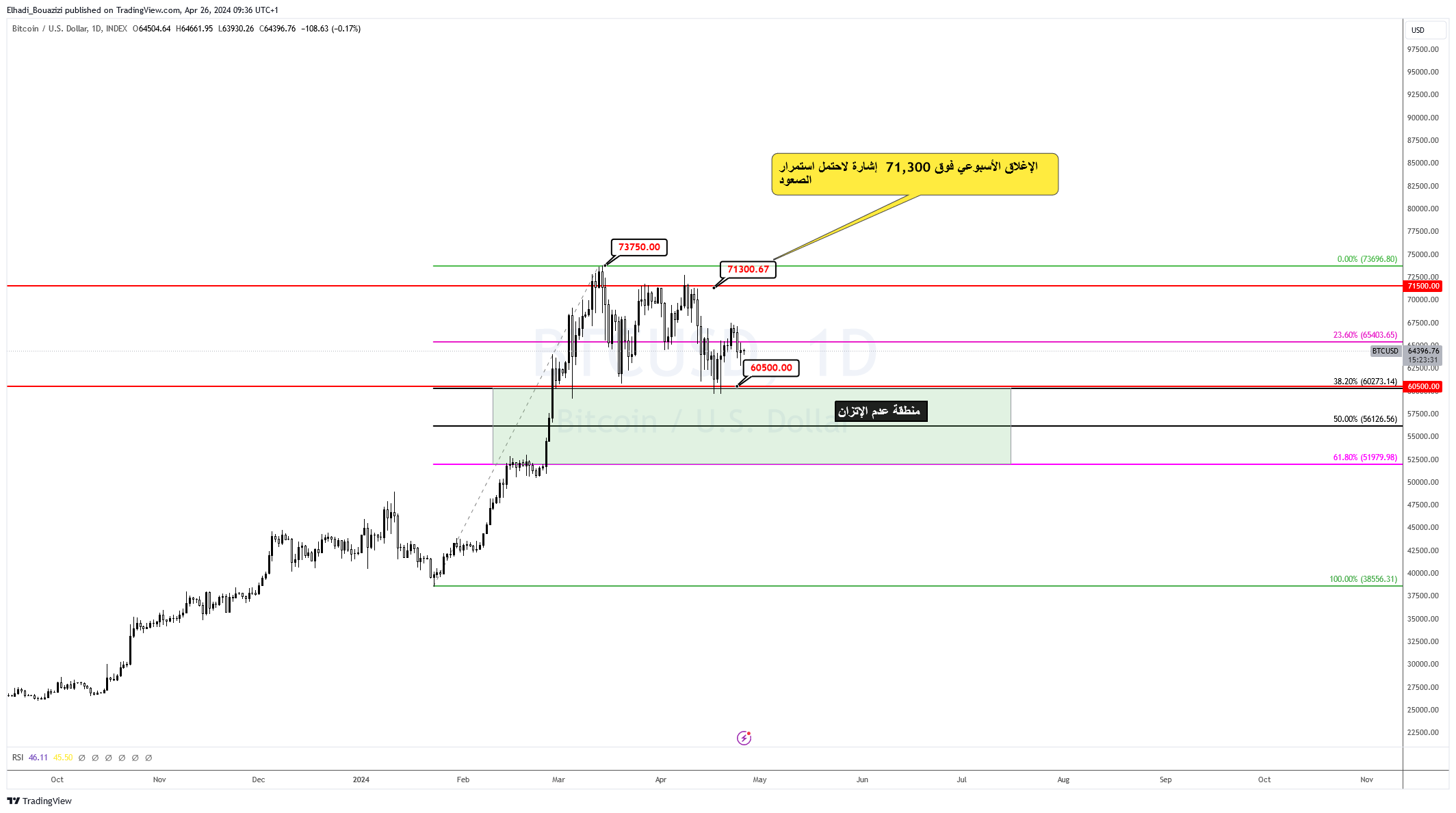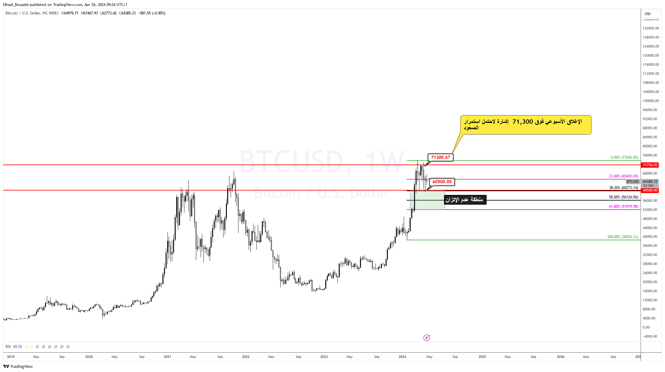 إذا تمكنت العملة الرائدة من الإغلاق الأسبوعي فوق هذا المستوى، فسيتشكل أعلى مستوى جديد بعد أسابيع من التراجع. وأيضا الإغلاق اليومي فوق أعلى قمة تاريخية في حدود 73,750 دولار.