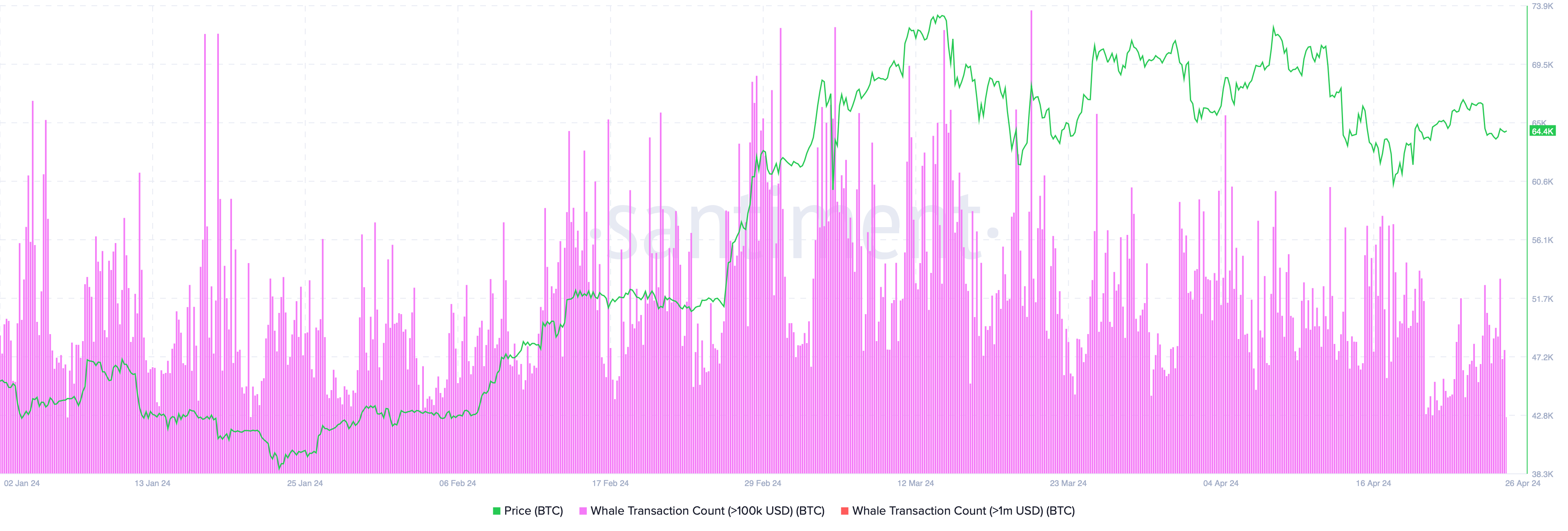 أظهر مؤشر عدد معاملات الحيتان (WTC)، الذي يتتبع عمليات تحويل عملة البيتكوين (BTC) بقيمة 100,000 دولار أو أكثر، ارتفاعات في كل مرة ينخفض فيها السعر.
