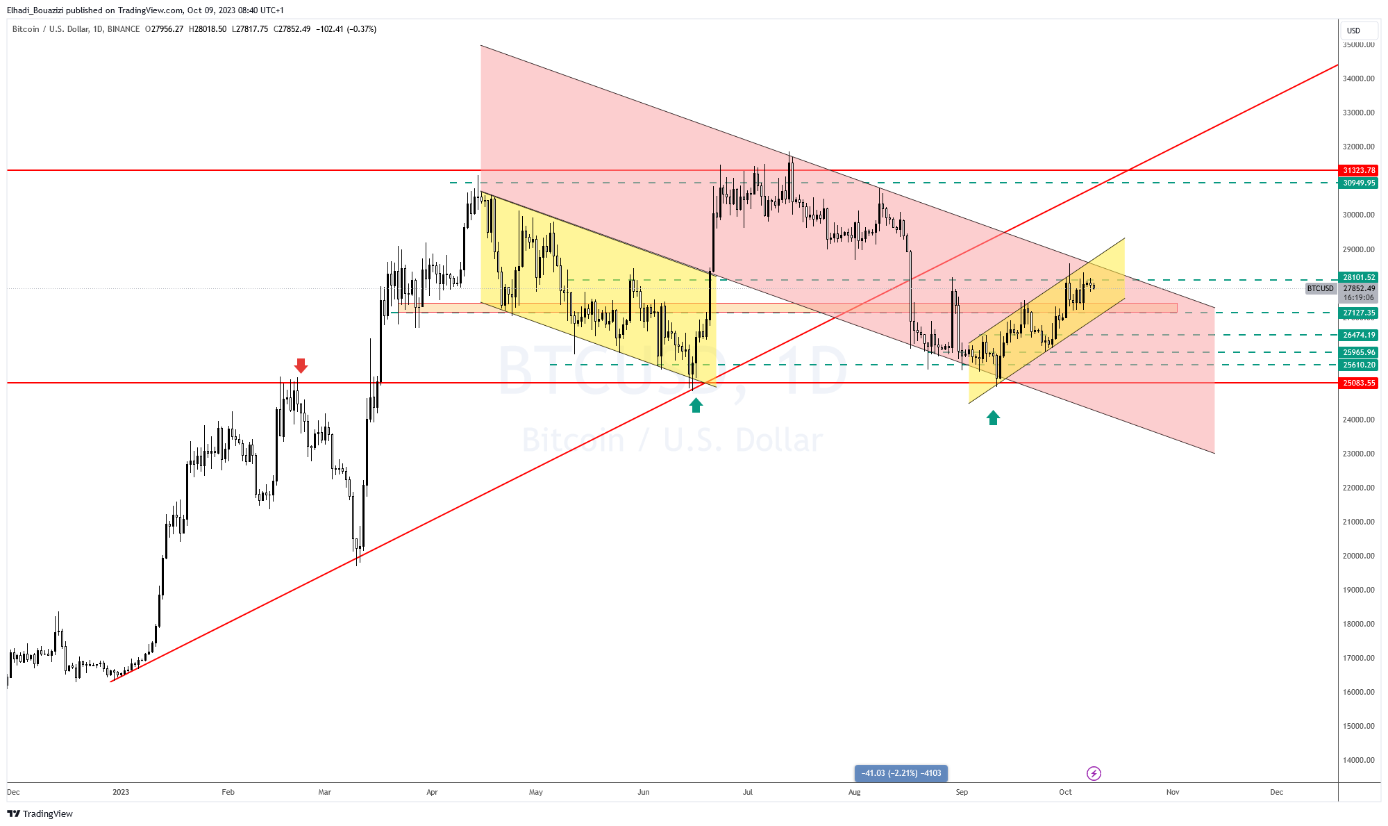 ومنذ اليوم الأول لشهر أكتوبر الجاري والسعر يتداول بين منطقة الدعم 27100 دولار و مستوى المقاومة 28100 دولار والحد العلوي للقناة السعرية الهابط (خط الاتجاه).