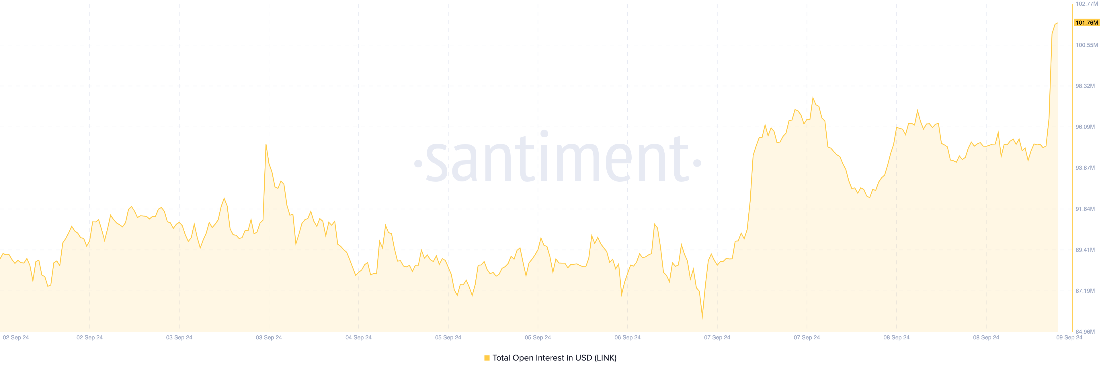 أحد المؤشرات الرئيسية التي تدعم الارتفاع الأخير في تشينلينك هو ارتفاع الفائدة المفتوحة (OI). تتبع OI عدد العقود النشطة المرتبطة بالعملة المشفرة، مما يعكس تفاعل السوق. يشير ارتفاع OI إلى زيادة السيولة والاهتمام بتلك العقود، بينما يشير الانخفاض إلى تقليل التعرض.