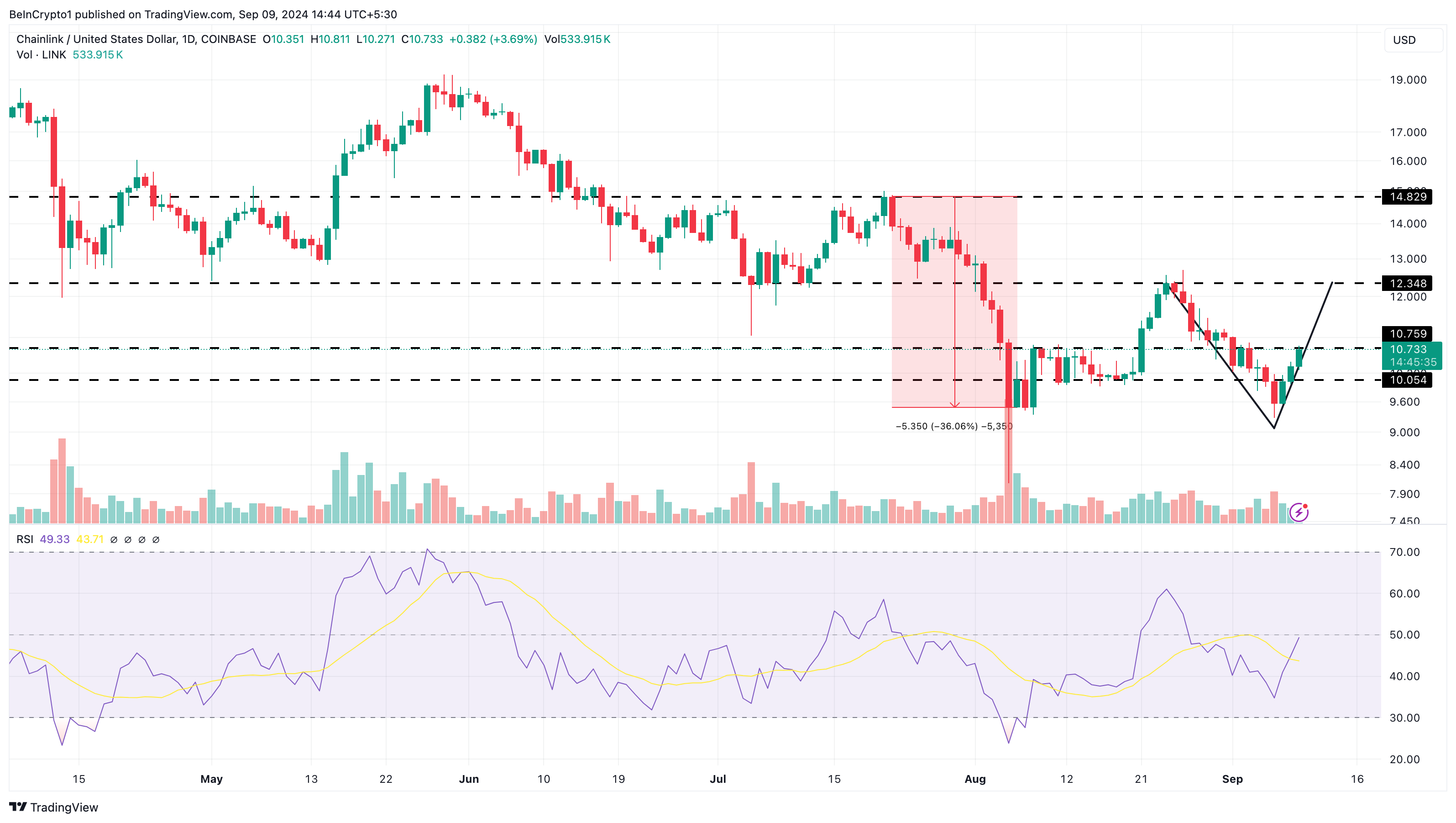 يتداول سعر تشينلينك حاليًا عند 10,74$، وقد وصل إلى هذا المستوى بعد أن دافع الثيران بنجاح عن دعم 10,05$. وفقًا للرسم البياني اليومي، قد تكون العملة المشفرة تشكل تعافيًا على شكل حرف V — ارتدادًا حادًا بعد انخفاض حاد. انخفض سعر LINK إلى 9,57$ في 8 سبتمبر قبل أن ينعكس عند ذلك المستوى.