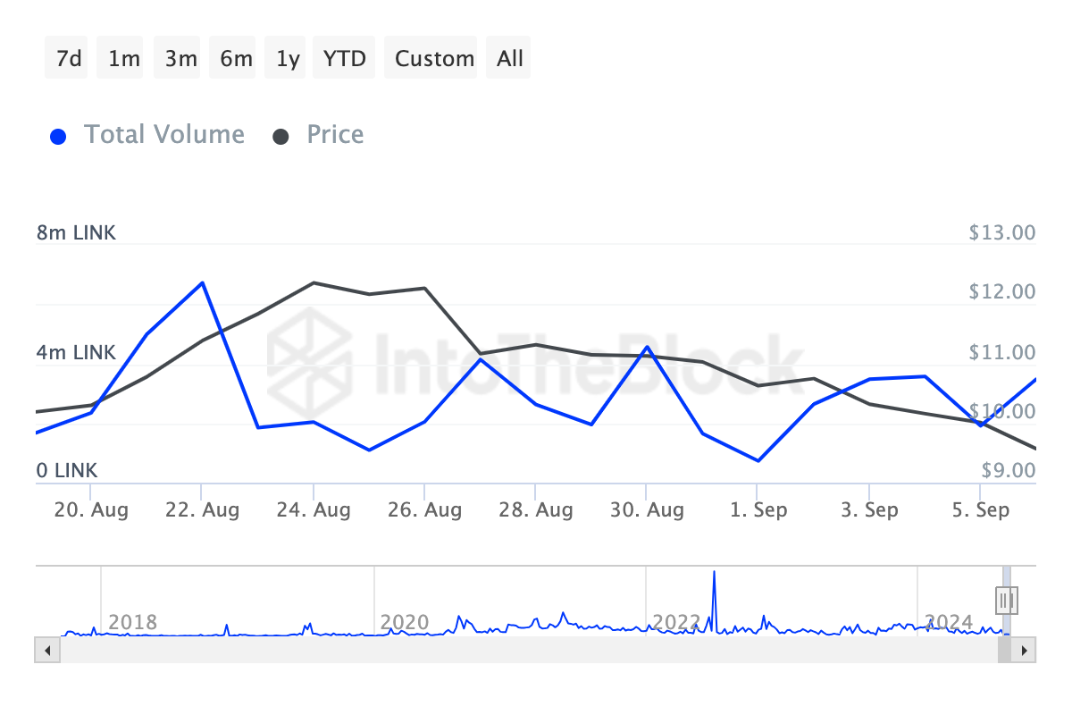 علاوة على ذلك، شهدت تشينلينك ارتفاعًا في المعاملات الكبيرة منذ 5 سبتمبر، مما يشير إلى زيادة السيولة حول العملة المشفرة. ومع ذلك، لا يشير ارتفاع المعاملات الكبيرة دائمًا إلى ضغط صعودي. إذا ارتفعت هذه المعاملات أثناء انخفاض السعر، فإن ذلك يشير إلى ضغط بيع مهيمن.