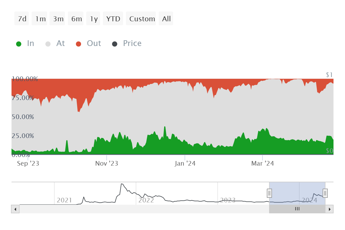 في الوقت الحاضر ، يحقق حوالي 21٪ من المستثمرين الذين يجرون معاملات على الشبكة أرباحا ، وهو أمر مثير للقلق. هذا لأنه ، على الأرجح ، يتطلع حاملو SHIB إلى البيع وسط انخفاض الأسعار. نظرا لأن هذا من شأنه أن يعوض خسائرهم ، فيمكنهم التخلص من ممتلكاتهم حتى تنشأ ظروف سوق أكثر ربحية.