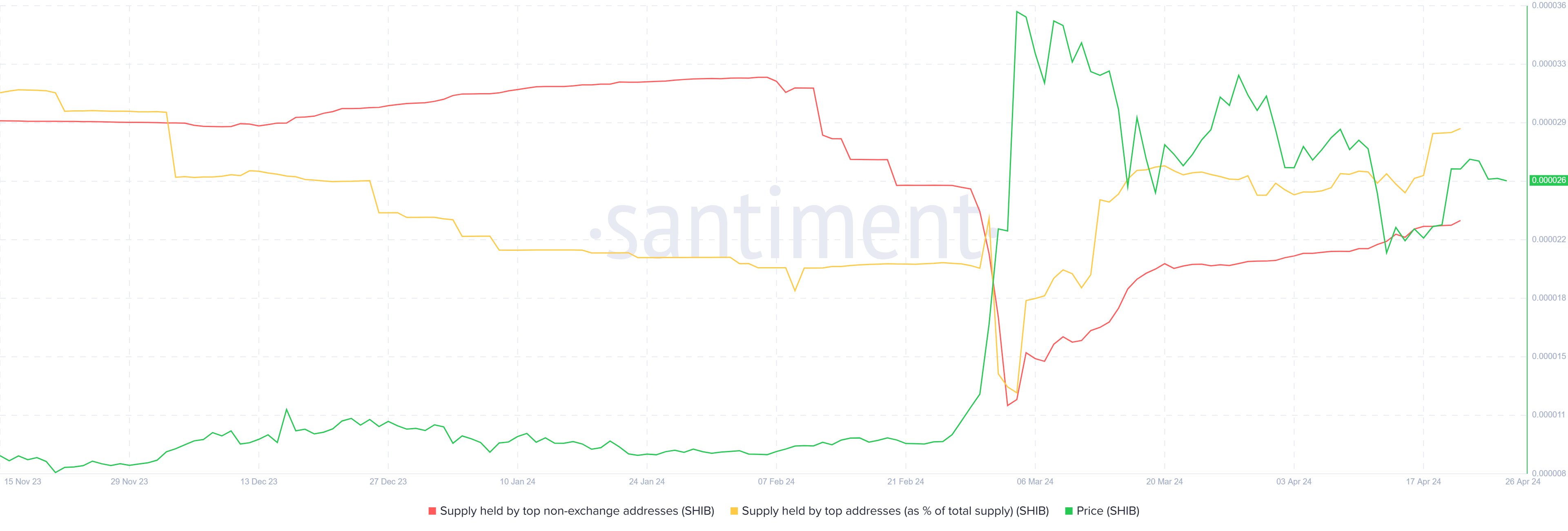 أضافت عناوين الحيتان العليا التي تزيل محافظ الصرف ما يزيد قليلا عن 13 تريليون SHIB بقيمة حوالي 328 مليون دولار في الشهرين الماضيين. يشير هذا إلى أن حاملي SHIB لا يتم تحفيزهم لتجميع الرمز المميز.