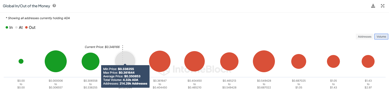 أدى ذلك إلى طلب قوي على ADA. حوالي 4,32 مليار ADA بقيمة 1,57 مليار دولار تقترب من تحقيق الربحية. يظهر مؤشر الدخول/الخروج العالمي (GIOM) أن هذا العرض تم شراؤه بين 0,33 و0,36 دولار. قد يجعل الخروج من نمط الوتد الهابط هذا العرض مربحًا.