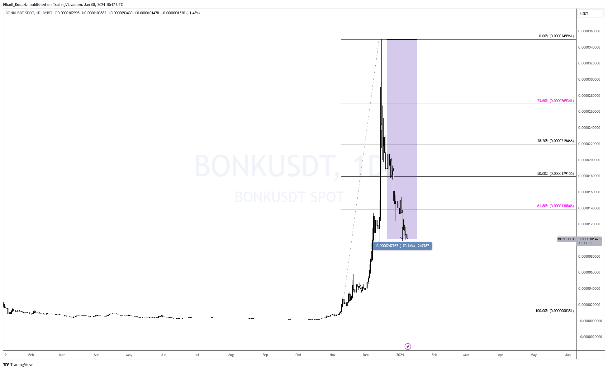 حسنا، ليس هناك ما يمكننا قوله من الناحية الفنية عن هذه العملة. وكما هو موضح في الرسم البياني المرفق فقد خسر سعر BONK أكثر من 70% من قيمته منذ أبلغ ذروته.