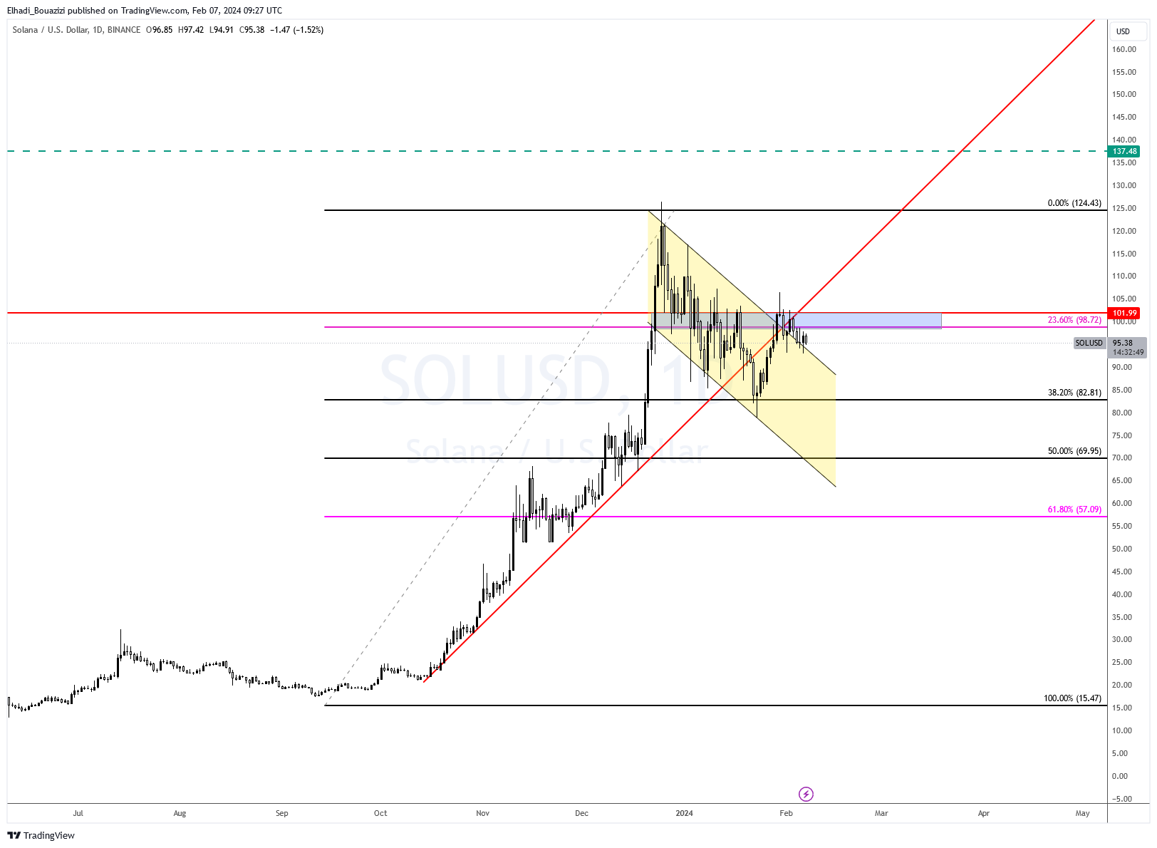 Sponsoredفنيا، سعر SOL ما زال يتراوح تحت منطقة المقاومة 98 – 102 دولار. في حالة تمكن من اختراقها ستكون إشارة إيجابية لعودة السعر إلى مستوى 120 دولار.