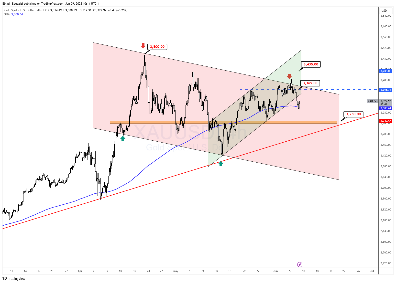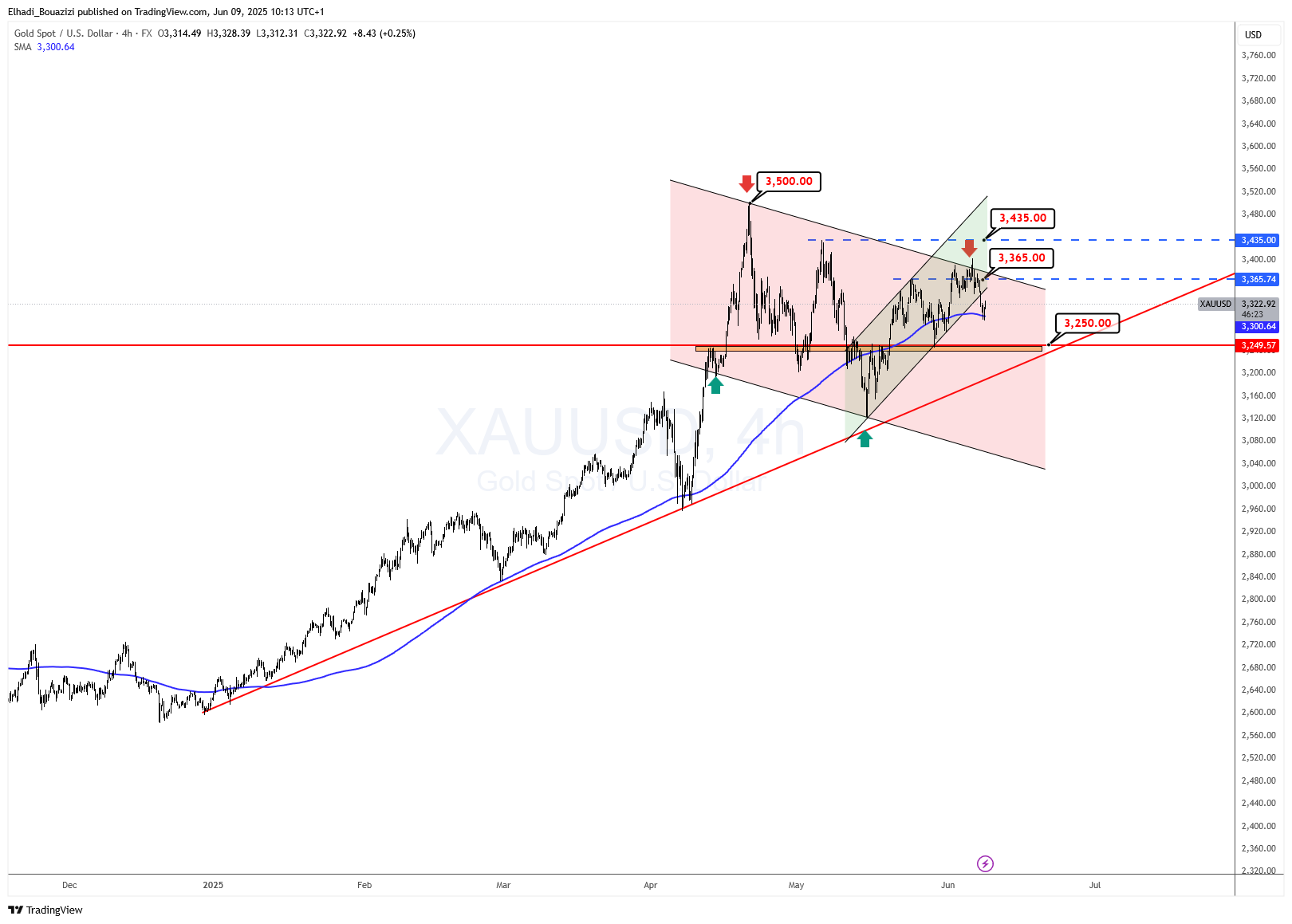 يُظهر الرسم البياني للذهب على الإطار الزمني 4 ساعات مسارًا متداخلًا بين ثلاث قنوات رئيسية: قناة هابطة عريضة ممتدة من قمة 3500 دولار، وقناة صاعدة فرعية تم كسرها مؤخرًا، بالإضافة إلى خط اتجاه صاعد طويل الأمد انطلق من قاع أبريل.