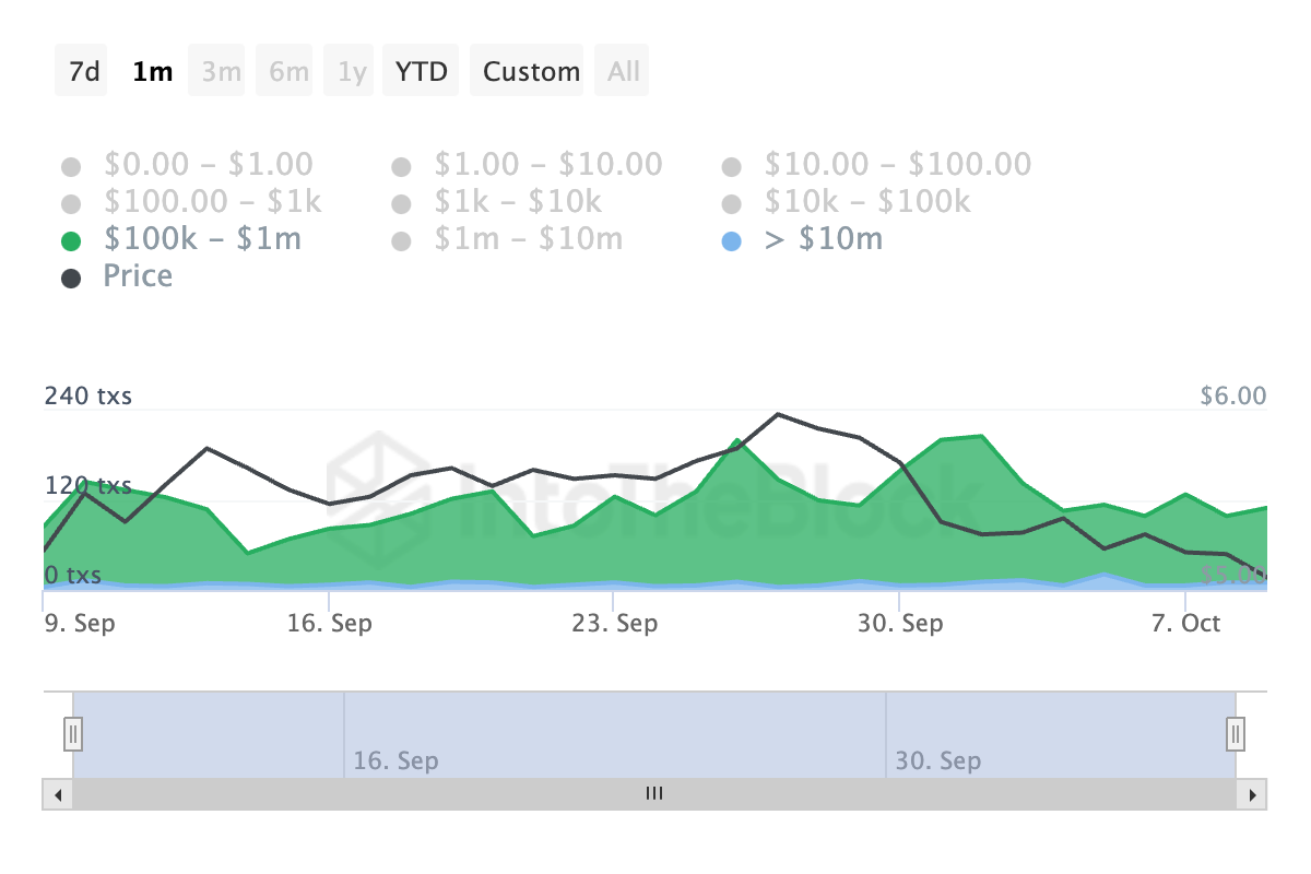 غادر بعض حاملي TON الرئيسيين السوق، كما يتضح من انخفاض عدد المعاملات الكبيرة اليومية. تظهر بيانات IntoTheBlock أن العدد اليومي لمعاملات TON التي تتراوح قيمتها بين 100,000$ و1 مليون$ قد انخفض بنسبة 24% خلال الشهر الماضي. خلال نفس الفترة، انخفضت المعاملات الأكبر التي تزيد قيمتها عن 10 ملايين$ بنسبة 23%.