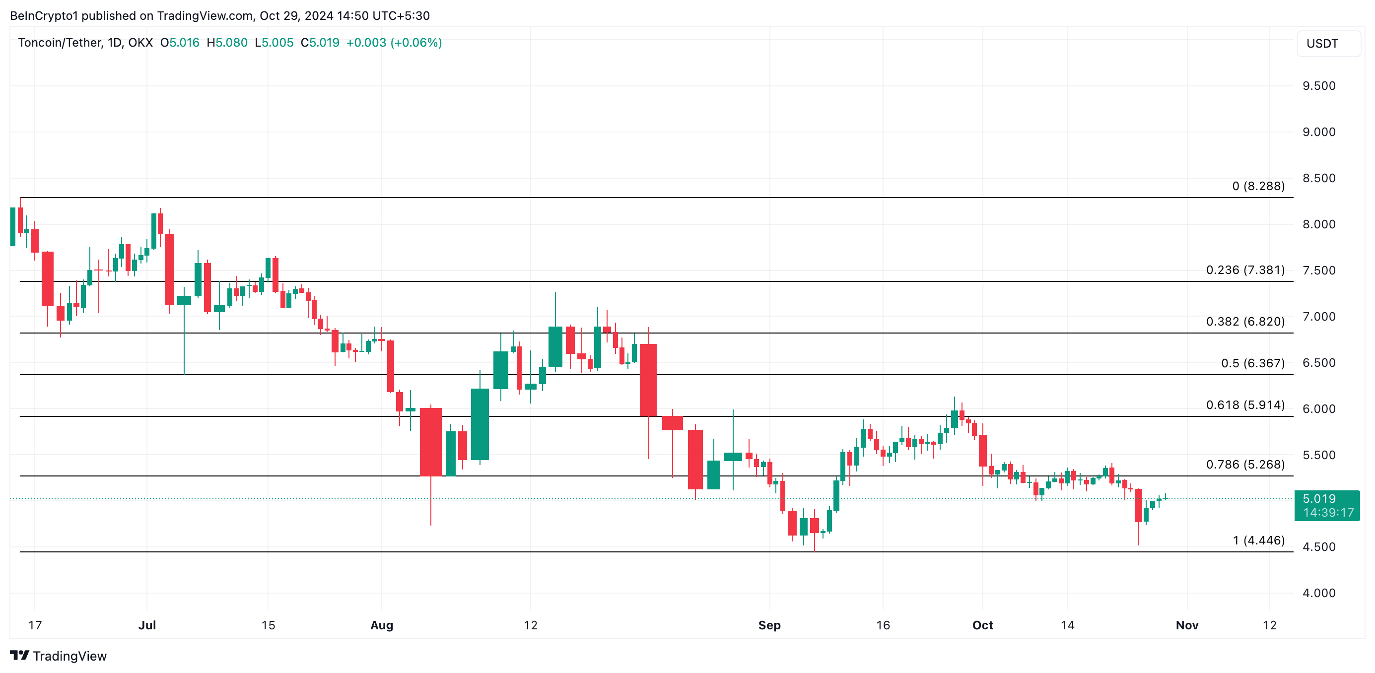 يتم تداول تونكوين بسعر 5٫06 دولار في وقت النشر، أقل بقليل من المقاومة التي تشكلت عند 5٫26 دولار. إذا استمرت مدة الحيازة في الزيادة واستمر الحيتان في تجميع العملة البديلة، فقد يتمكن سعر تون من تجاوز هذه المقاومة، مما يضعه على مسار نحو 5٫91 دولار. قد يدفع اختراق ناجح لهذا المستوى السعر إلى الارتفاع أكثر، مع المقاومة الرئيسية التالية عند 6٫82 دولار.