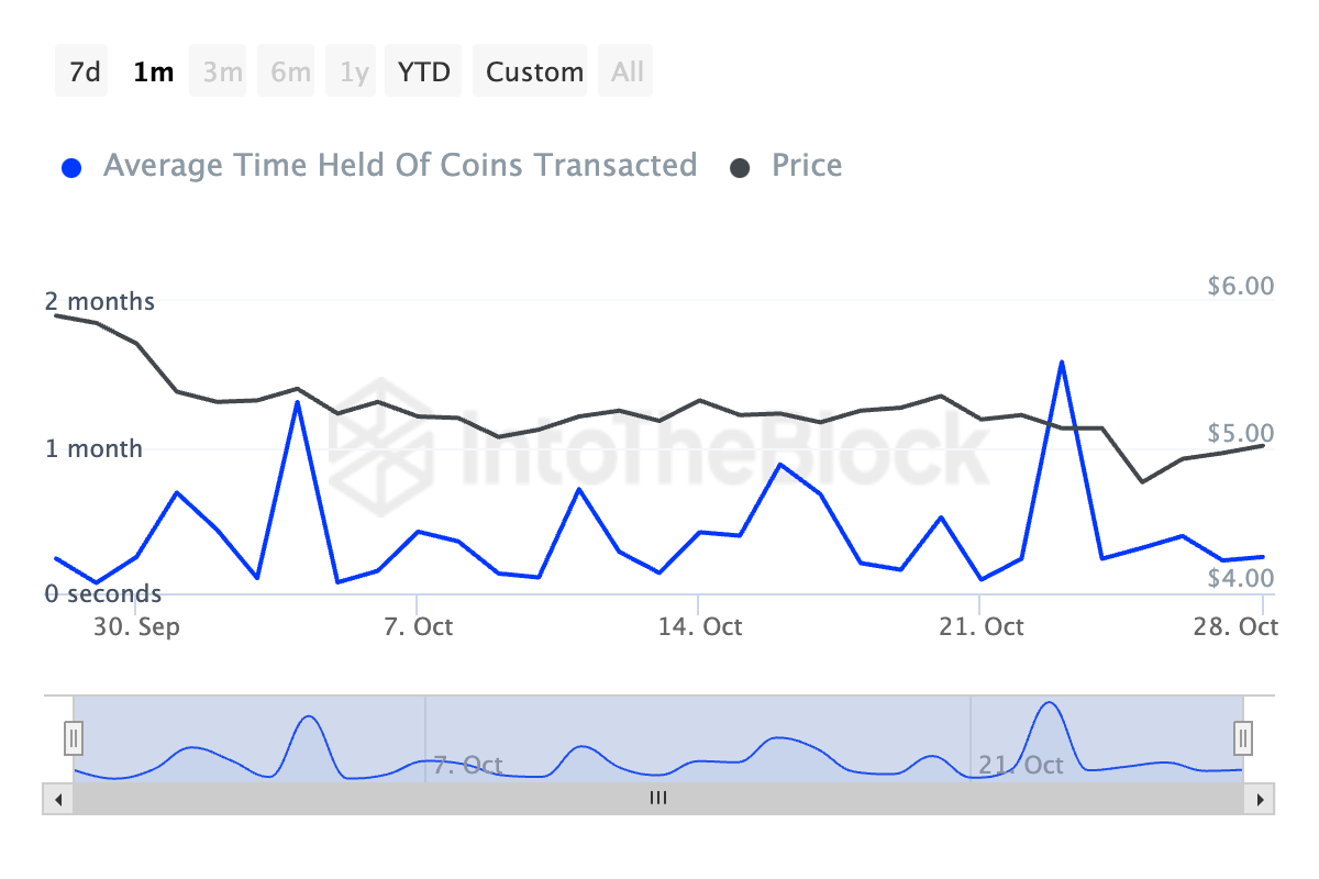 مع ارتفاع عدد حاملي TON، زادت أيضًا مدة الاحتفاظ بها. تظهر بيانات IntoTheBlock أن مدة الاحتفاظ بالعملة البديلة، التي تتبع المدة التي يتم خلالها الاحتفاظ بالعملات قبل تداولها، قد ارتفعت بنسبة 249% خلال الشهر الماضي.