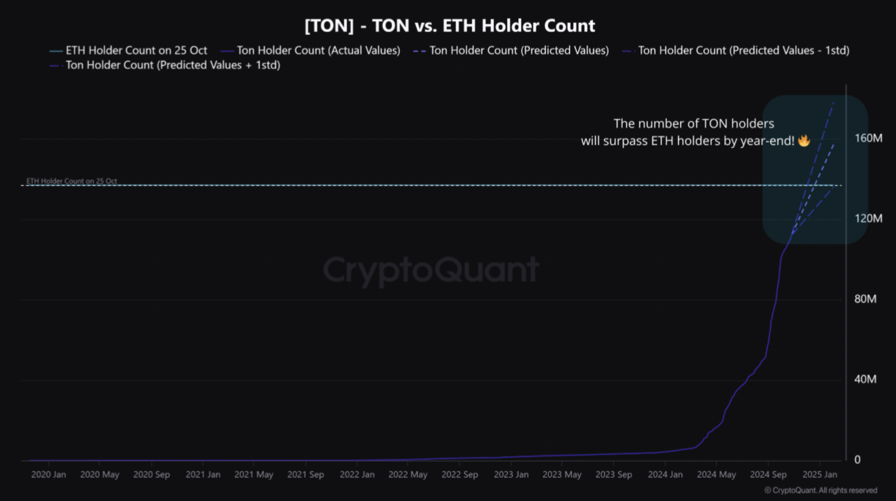 ومع ذلك، أضاف المحلل تحذيرًا. قال إن زيادة عدد حاملي TON كانت متسارعة، لكن المعدل قد يتباطأ في الأشهر القادمة. تشير التقديرات الأكثر حذرًا إلى أن نقطة التقاطع قد تتأخر حتى 3 فبراير 2025.