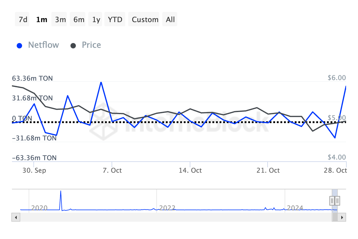بالإضافة إلى ذلك، خلال فترة الـ30 يومًا الماضية، قام حيتان تون أو المستثمرون الكبار بزيادة تجميعهم، كما يتضح من ارتفاع صافي تدفق الحاملين الكبار. وفقًا لبيانات IntoTheBlock، فقد ارتفع بأكثر من 15000% خلال الشهر الماضي.