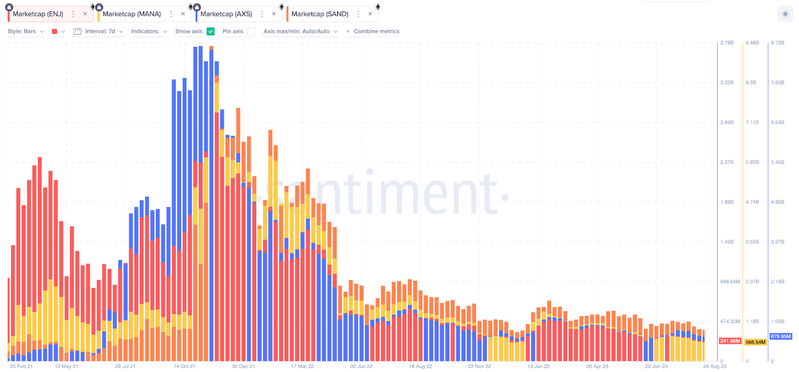 وبالتالي، اعتبارًا من سبتمبر 2023، تبلغ قيمة SAND وAXS وENJ وMANA مجتمعة الآن 1.23 مليار دولار. ليمثل هذا انخفاضًا بنسبة 92% عن القيمة السوقية البالغة 16 مليار دولار المُسجلة في نوفمبر 2021.