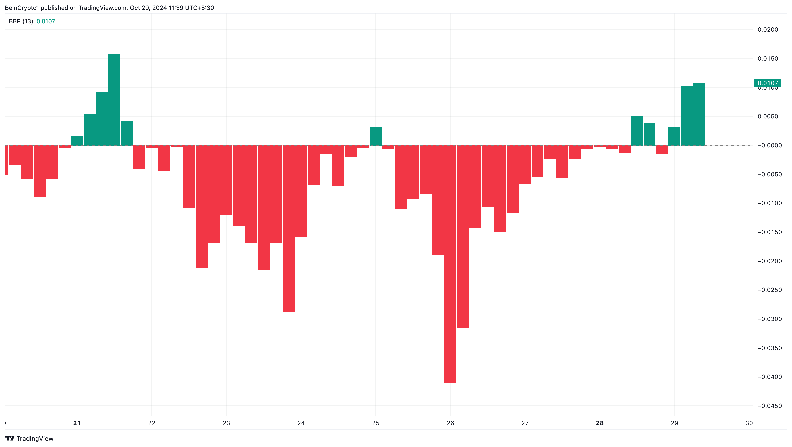 يقيس BBP توازن ضغط الشراء والبيع. عندما تظل القراءة في المنطقة الإيجابية، غالبًا ما يشير ذلك إلى استمرار الزخم الصعودي. ومع ذلك، قد يشير انخفاض في BBP إلى ضعف قوة المشترين، مما ينذر بتراجع محتمل.