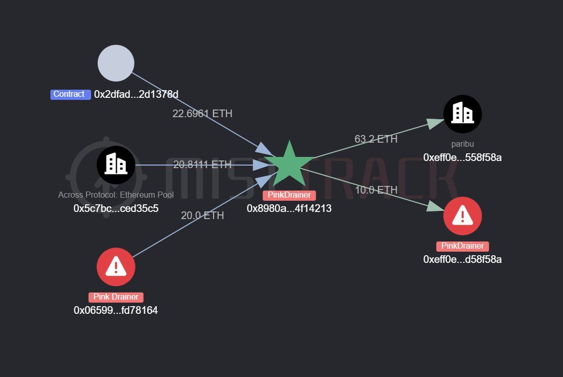 أصبح عنوان مرتبط ببينك درينرز ضحية لعملية احتيال تسمم العناوين، وفقًا لأداة تتبع العملات المشفرة ميست تراك. في أواخر يونيو، خسرت المنظمة المشهورة بالاحتيال 10 إيثريوم (ETH)، تُقدر بحوالي 30,000 دولار، لعنوان محفظة مزيف.