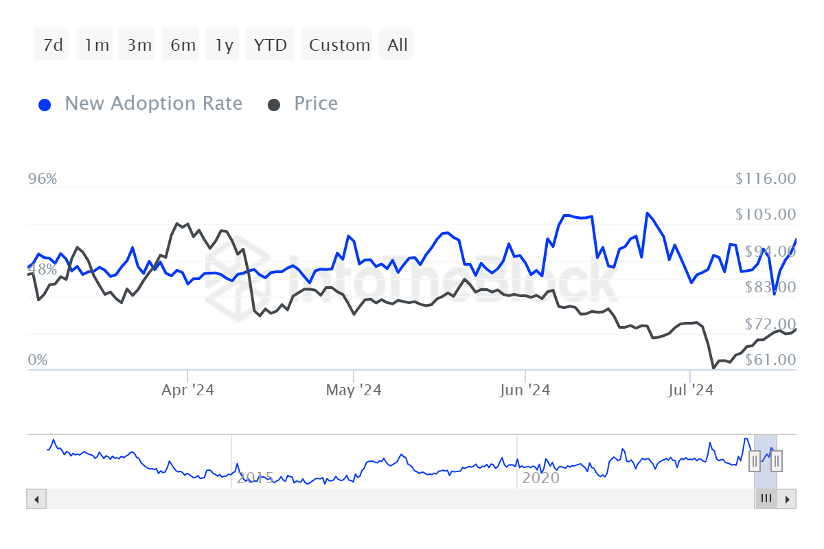 من ناحية أخرى، لا يزال المستثمرون الجدد يظهرون علامات إيجابية. كما يتضح من معدل التبني الجديد، فإن عدد العناوين الجديدة التي تجري معاملات على الشبكة مقارنة بالعناوين النشطة لا يزال مرتفعًا.