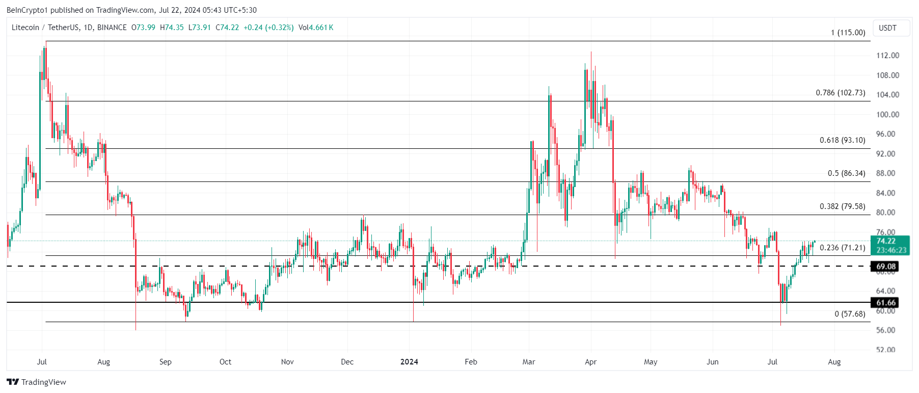 الثاني هو حقيقة أن LTC قد قلب خط استرجاع فيبوناتشي 23,6% كدعم. يُعرف هذا المستوى بأرضية دعم سوق الدب، ويميل إلى منع أي انخفاض. سيدعم ذلك الزخم الجانبي، معززًا التوطيد بين 79$ و71$.