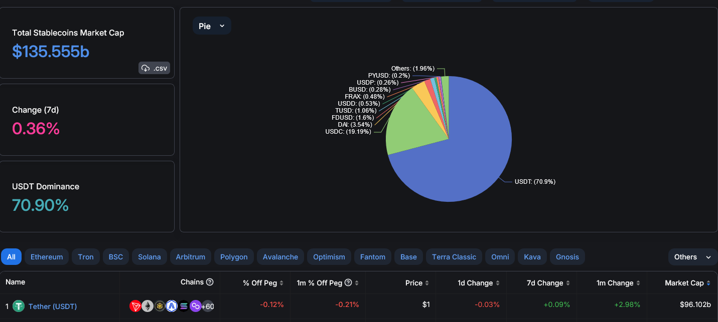 وارتفعت حصة عملة USDT في السوق خلال العامين الماضيين لتبلغ حاليا حوالي 70% يقيمة سوقية تبلغ 96 مليار دولار، حسب بيانات منصة defillama.