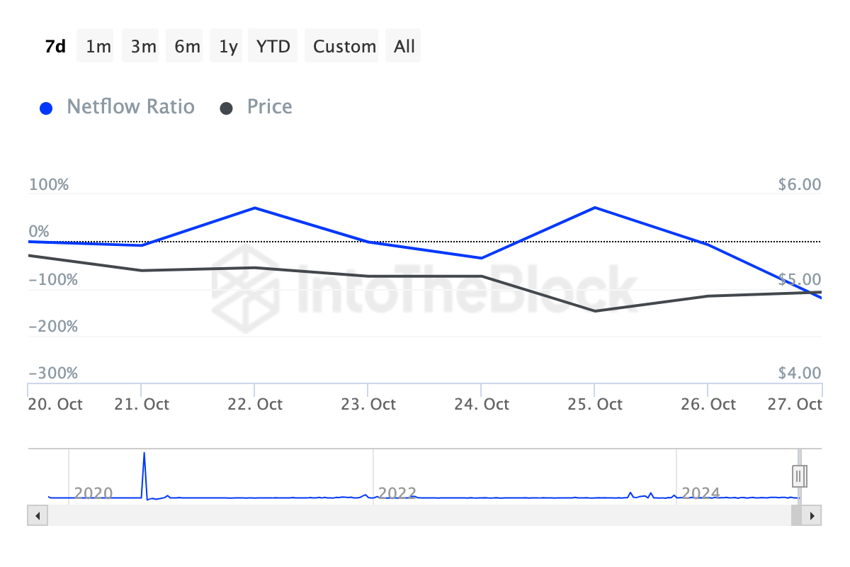 مقياس آخر يدعم هذا التحيز هو نسبة صافي تدفق الحاملين الكبار إلى البورصة. يُظهر هذا المقياس بشكل أساسي ما إذا كان الحاملون الكبار لعملة مشفرة يرسلون المزيد من الرموز إلى بورصة.