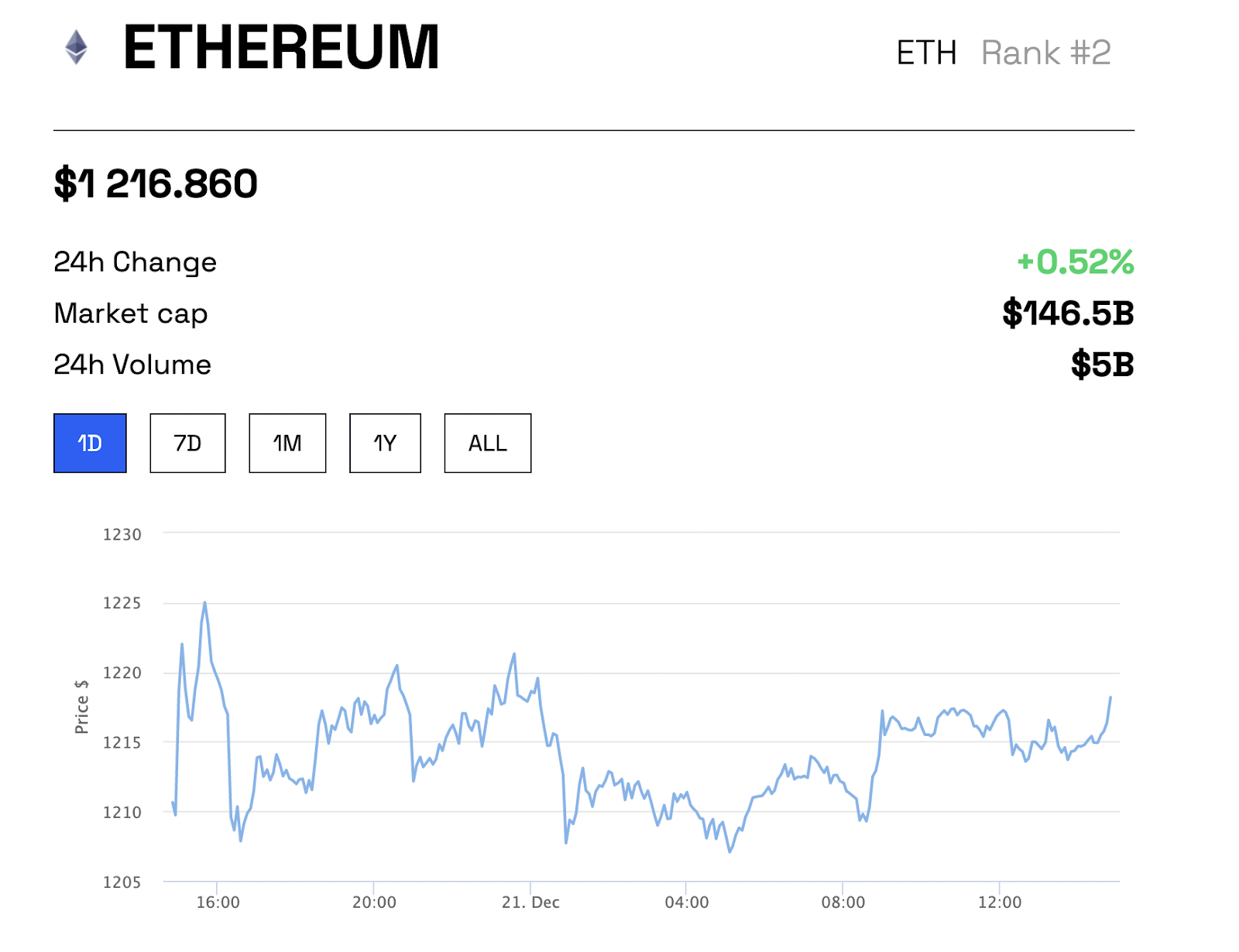 وفي وقت نشر هذا الخبر يتداول الإيثر عند نحو 1216 دولار مع سقف سوقي يزيد عن 146 مليار دولار.