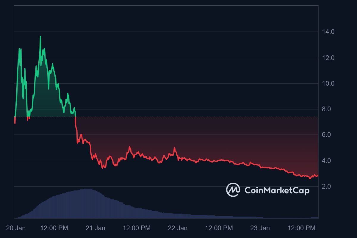 تسبب البيع الضخم للحوت في انخفاض سعر عملة ميلانيا $MELANIA بنسبة 32% خلال اليوم، لتصل إلى 2.57 دولار. وتشير بيانات منصة CoinMarketCap إلى انخفاض حجم التداول بنسبة 50% ليصل إلى 309.43 مليون دولار، مما يعكس تراجع اهتمام المستثمرين بهذه العملة. كما فقدت العملة 80% من قيمتها منذ ذروتها عند 13.73 دولار.
