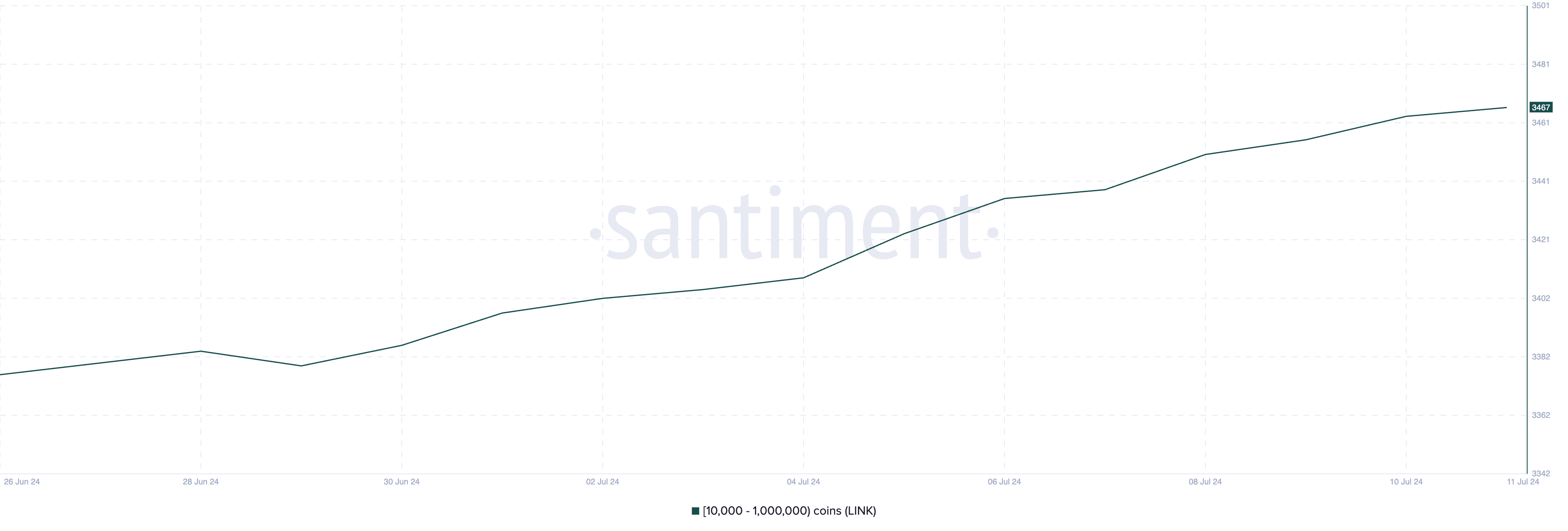 تظهر البيانات على السلسلة من Santiment أن حيتان LINK كانت مشغولة في الأسابيع القليلة الماضية. زاد عدد حيتان LINK الذين يحملون بين 10,000 و 1,000,000 رمز بشكل مطرد منذ 20 يونيو. عند 3,474 عنوان في وقت النشر، زاد عددهم بنسبة 3.3%، وهو أعلى عدد لهم منذ نوفمبر 2023.