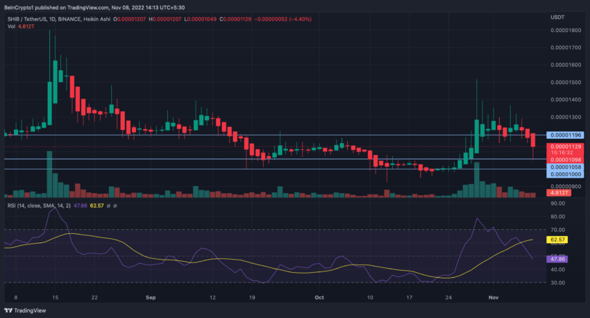 وفيما يخص سعر عملة شيبا، فقد مثلت علامة 0.0000100 دولار دعم /مقاومة رئيسية حيث يشير الرسم البياني للأسعار إلى انخفاض سعر العملة على مدار الثلاثة أيام الماضية، بانخفاض نسبته 16% من مستوى 0.0000120 دولار.