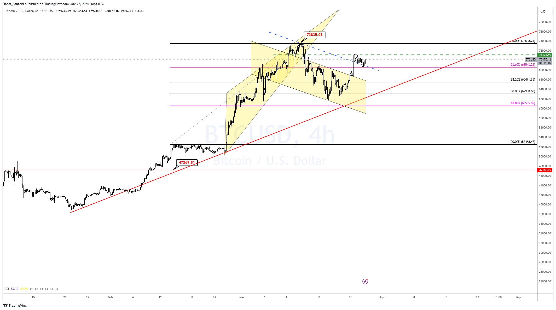 بعد الارتفاعات القوية في أول أيام الأسبوع الحالي، تراجع الزخم واستقرت تداول سعر البيتكوين BTC بين المستويين 68,500 – 71,100 دولار. مع حالة الترقب و الهدوء التي تعمّ السوق بعد أسابيع عديدة من الصخب الصاعد.