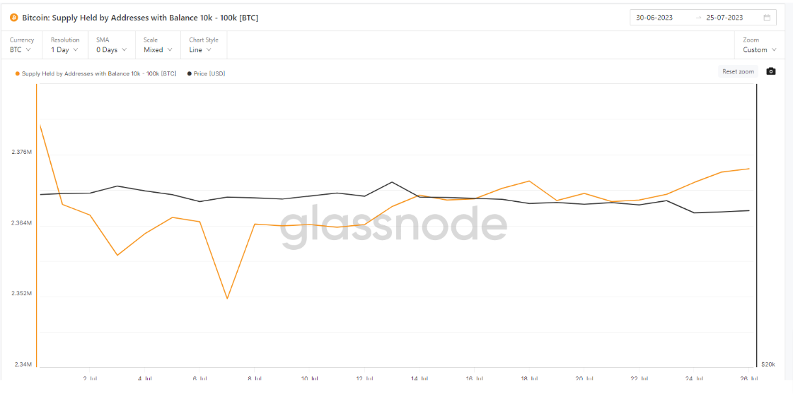 لوحظ أن الإمداد البيتكوين المحتفظ به في عناوين مع رصيد بين 10 و100 BTC قد انخفض قليلاً. مما يشير إلى أن أصحاب البيتكوين الكبار يرغبون في الانتظار في الوقت الحالي.