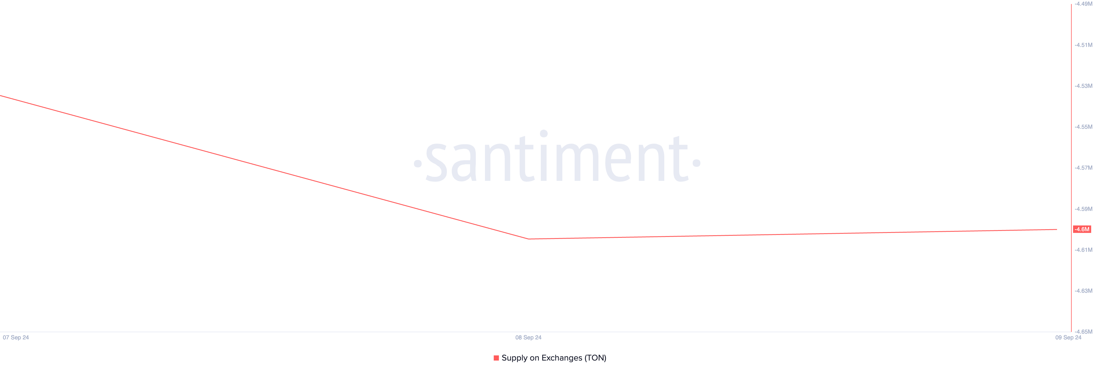بالإضافة إلى زيادة نشاط الحيتان، كان هناك انخفاض في عمليات البيع بين حاملي TON. تقارير سانتيمنت انخفاضًا بنسبة 5% في عملات TON المحتفظ بها في البورصات منذ 4 سبتمبر، مما يشير إلى أن الحاملين ينقلون أصولهم إلى محافظ خاصة، مما يدل على استراتيجية الاحتفاظ طويلة الأمد.