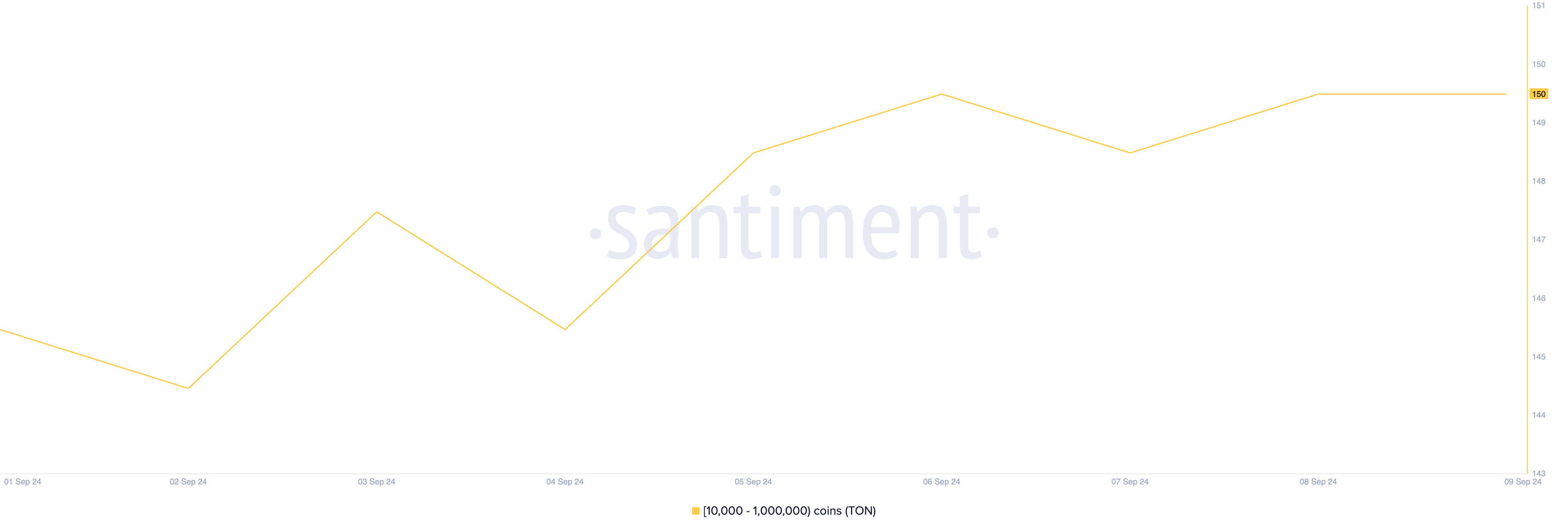 تظهر بيانات سانتيمنت زيادة ملحوظة في عدد حيتان TON خلال الأيام القليلة الماضية. وفقًا لمزود البيانات السلسلية، فإن العناوين التي تحتفظ بين 10,000 و1,000,000 TON قد ارتفعت بنسبة 3% في الأسبوع الماضي.