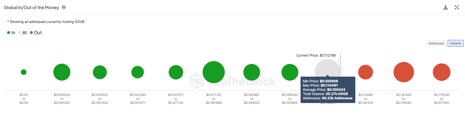 وفقًا لمؤشر الدخول/الخروج العالمي (GIOM)، تم شراء حوالي 35,27 مليار DOGE بين 0,105 و0,114 دولار. كانت هذه العملات التي تقدر قيمتها بنحو 4 مليارات دولار قد فقدت ربحيتها لو انخفض DOGE دون 0,105 دولار، والذي يعد بمثابة دعم حرج للعملة الميمية.