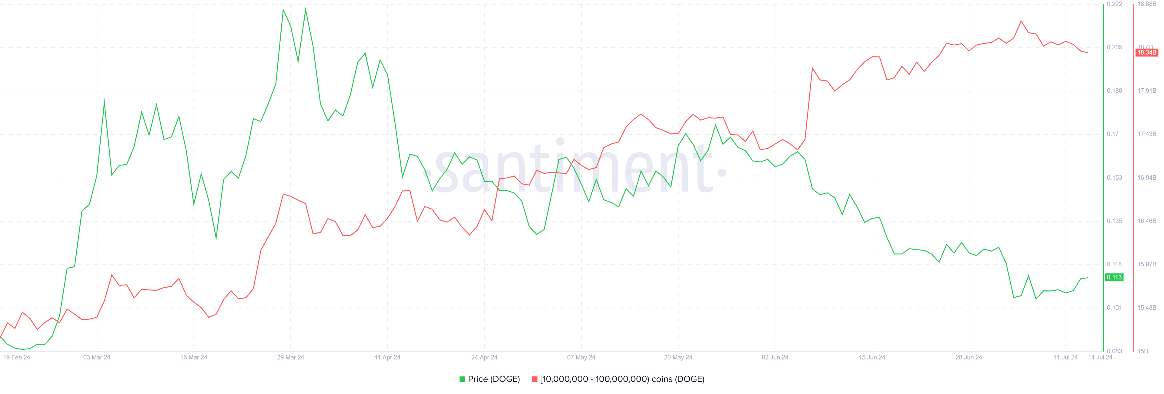 في آخر تسعة أيام فقط، شهدت العناوين التي تحتفظ بين 10 ملايين و100 مليون DOGE انخفاضًا بمقدار 400 مليون DOGE. إجمالي قيمة هذه العملات يبلغ 44,8 مليون دولار، مما يعني أن العملة الميمية قد تكبدت بالفعل هذه الخسارة.