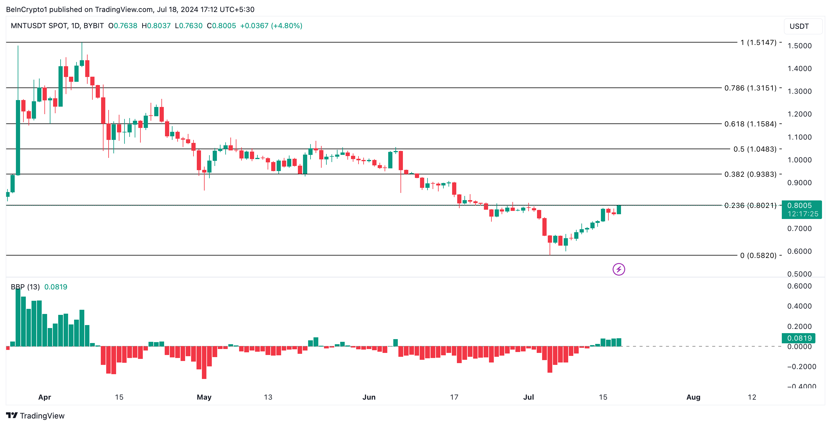 في وقت كتابة هذا التقرير، يقع مؤشر Elder-Ray لـ MNT فوق الصفر عند 0,08. وقد أظهر قيم إيجابية باستمرار منذ 13 يوليو.