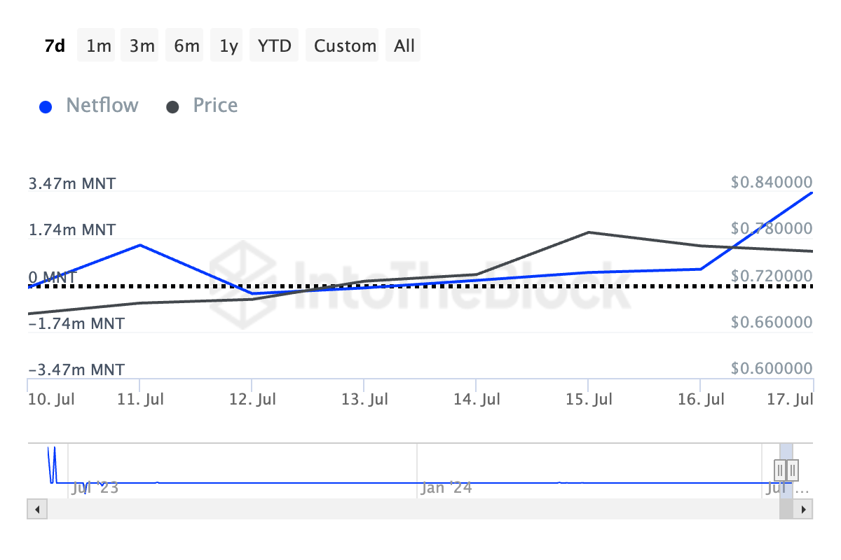 عندما يرتفع صافي تدفق الحاملين الكبار لأصل ما، فإن ذلك يشير إلى أن العناوين الكبيرة تشتريه. هذه إشارة صعودية. وفقاً لبيانات IntoTheBlock، ارتفع صافي تدفق الحاملين الكبار لـ MNT بنسبة 134% خلال الأيام السبعة الماضية.