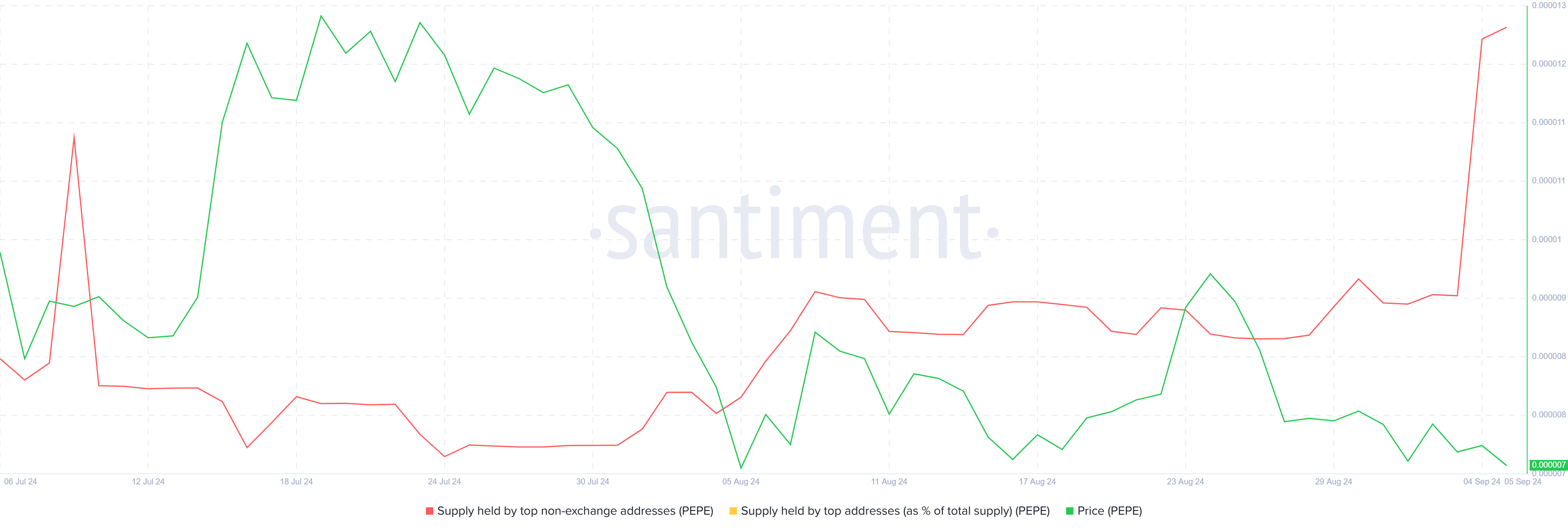 ومع ذلك، على الرغم من التوقعات السلبية من حاملي العملات طويلة الأجل،لعب نشاط الحيتان دوراً حاسماً في إبقاء سعر PEPE مرتفعاً. في وقت سابق من هذا الأسبوع، أضافت العناوين الرئيسية - باستثناء المحافظ المرتبطة بالبورصات - أكثر من 6 تريليونات PEPE، بقيمة تزيد قليلاً عن 42 مليون دولار.