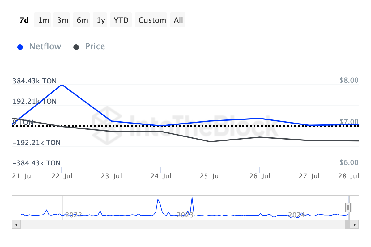 ومع ذلك، فإن النسبة السلبية تعني العكس، وهو ما ينطبق على TON. علاوة على ذلك، تظهر فحص دقيق أن الحيتان باعت 1,4 مليون عملة TON بين 21 و28 يوليو. إذا استمر هذا، فقد يفقد سعر TON بعض مكاسبه الطفيفة الأخيرة.