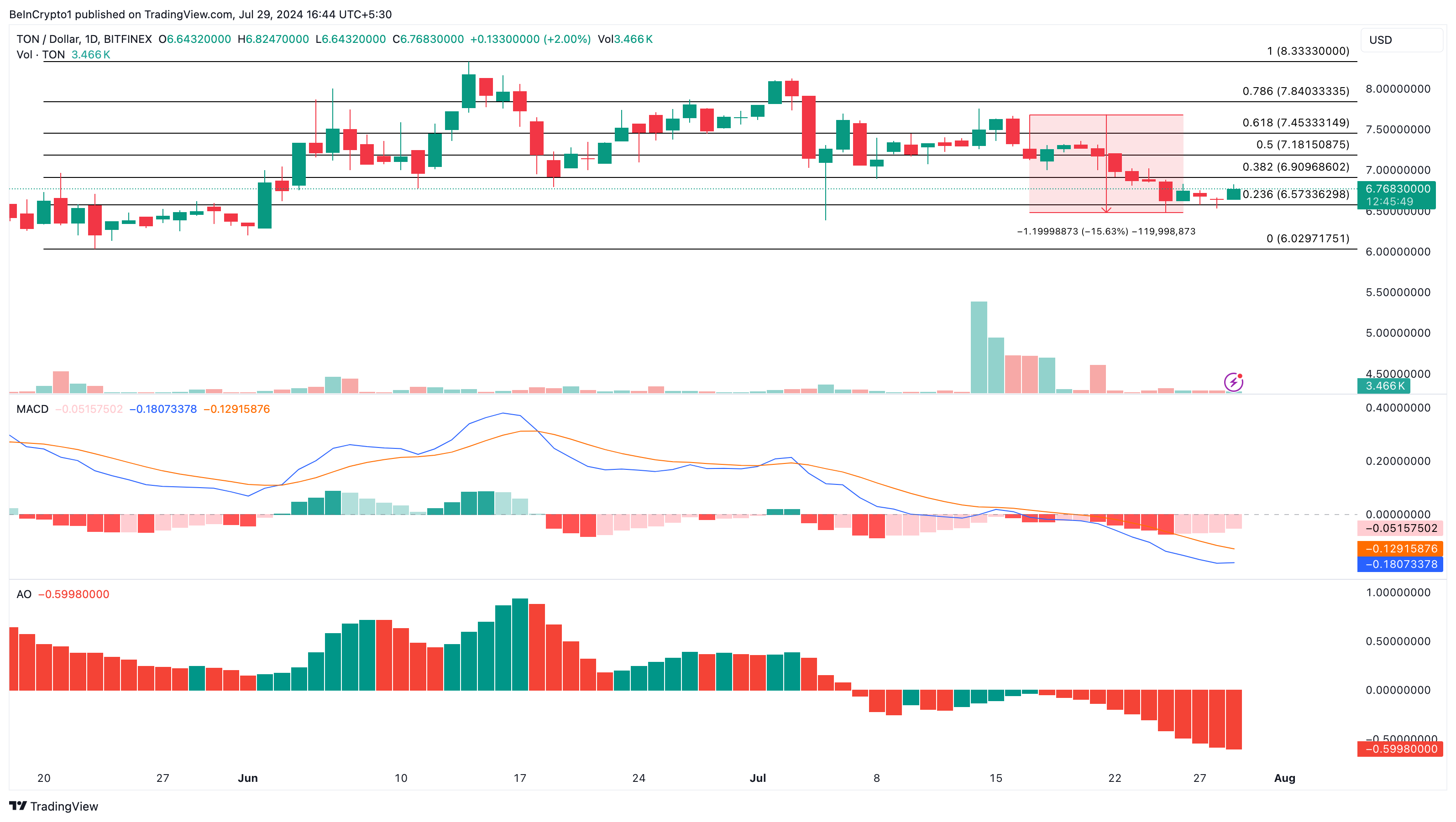 وفقاً للرسم البياني اليومي، فإن ارتفاع سعر تونكوين لا يدعمه مؤشرات حيوية. على سبيل المثال، المذبذب الرائع (AO) سلبي. يقيس AO زخم السوق ويحدد التغيرات المبكرة في سعر العملة المشفرة.